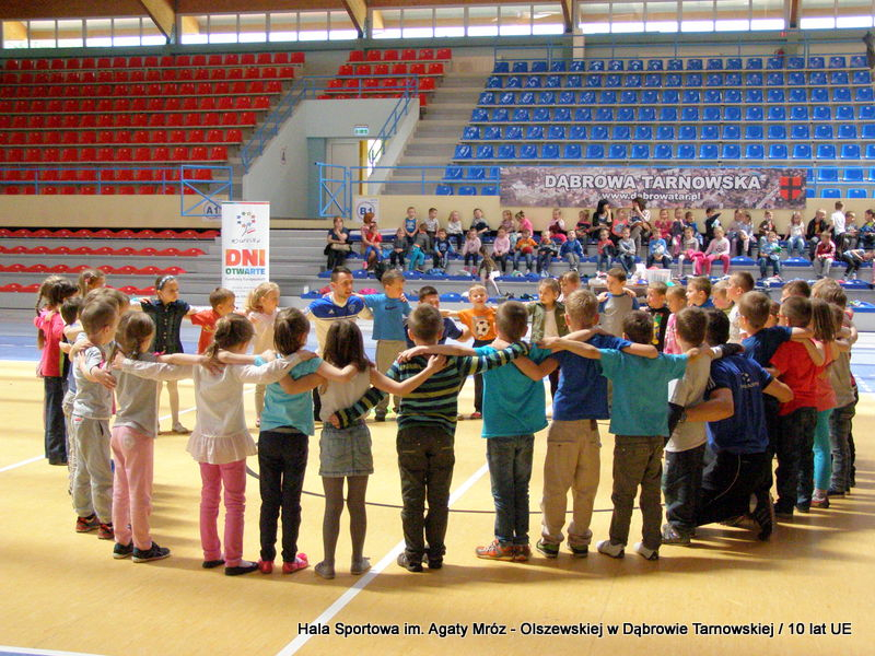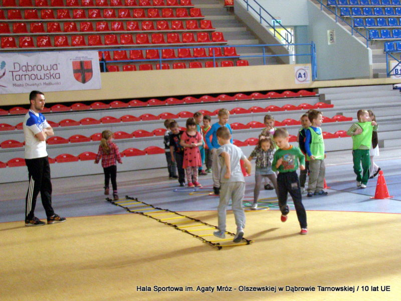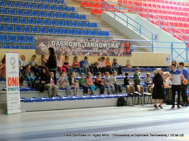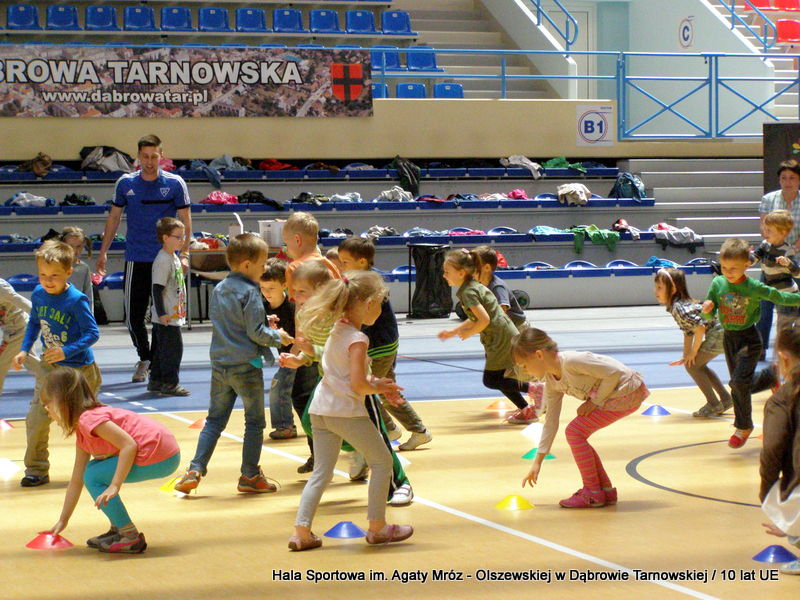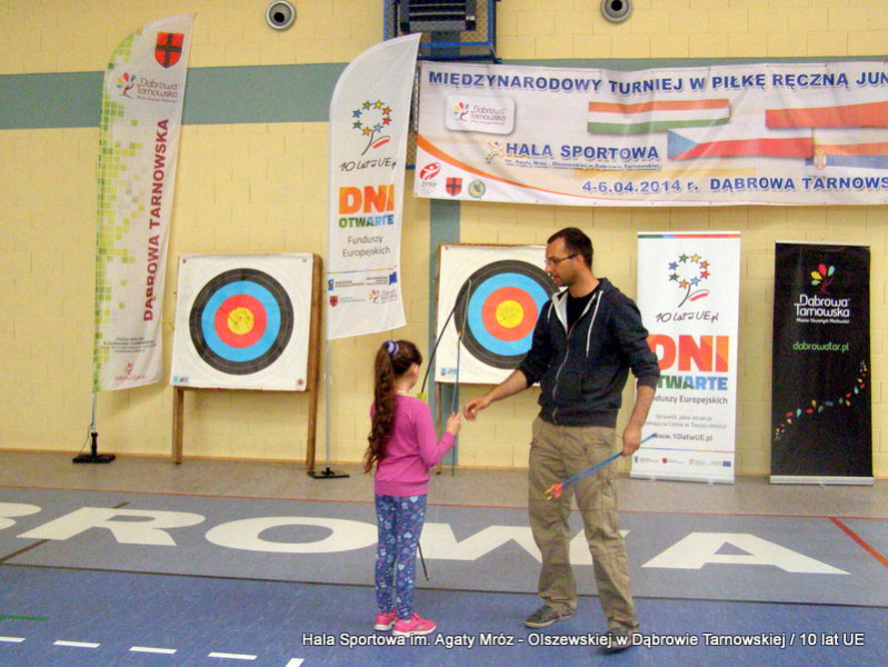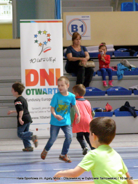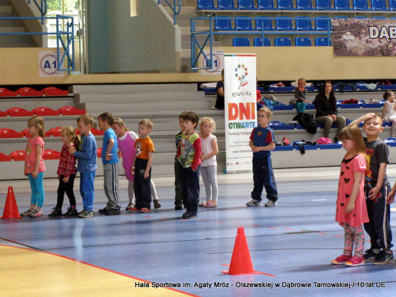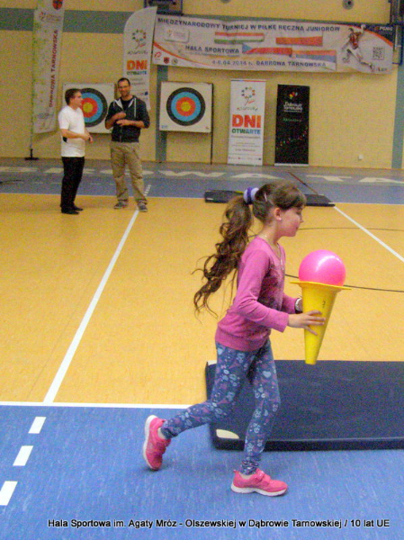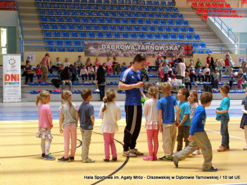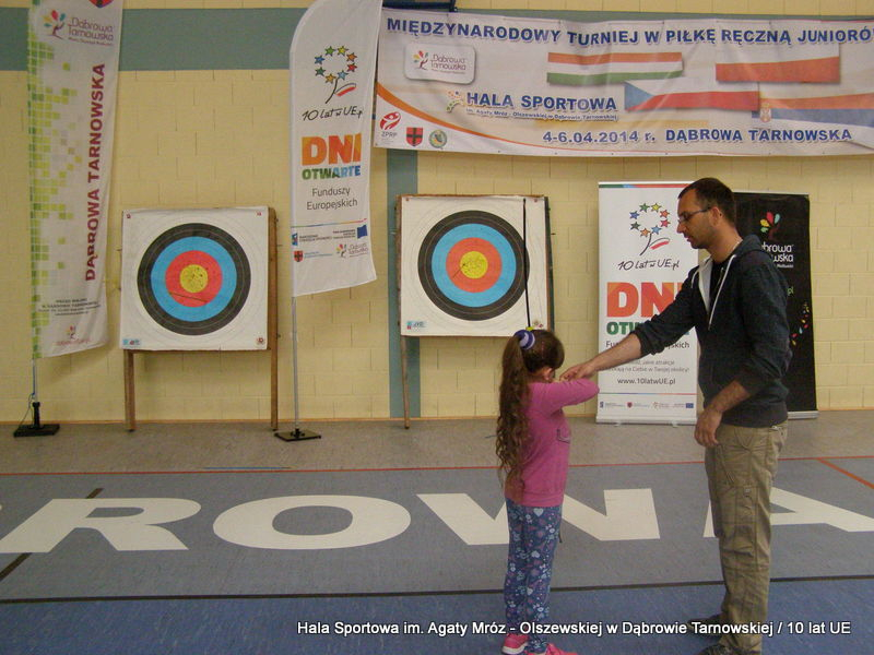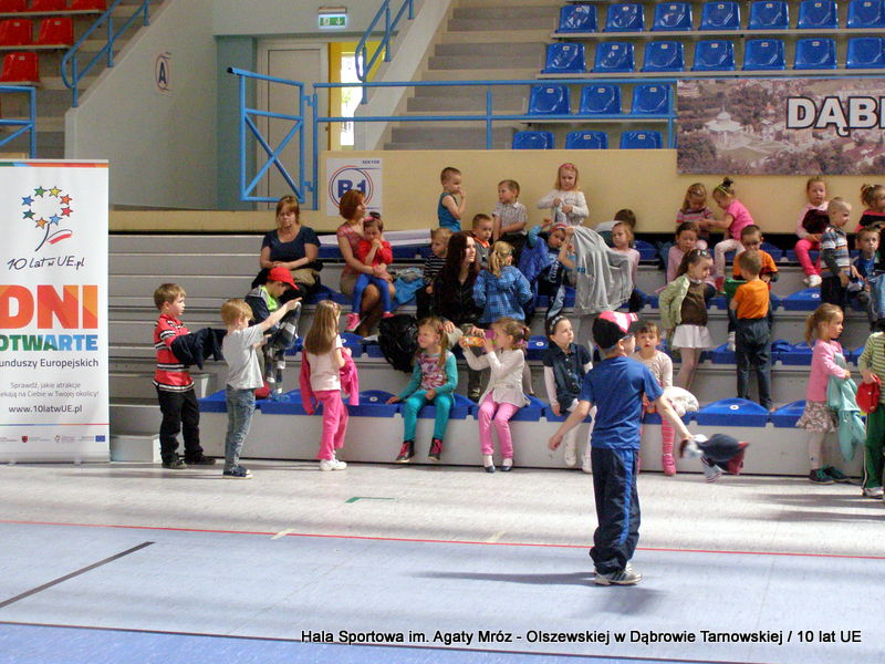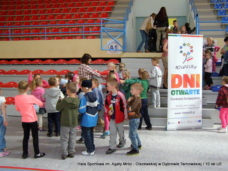 W niedzielę 11 maja przedszkolaki i starsze dzieci czekały wspaniałe atrakcje. Pracownica Referatu Kultury Fizycznej i Sportu Urzędu Miejskiego w Dąbrowie Tarnowskiej Anna Chmura przygotowała szereg zabaw i gier oraz specjalny tor z przeszkodami. Na zmęczonych czekała niesamowita niespodzianka w postaci puzzli, które przedstawiały obiekty w Dąbrowie Tarnowskiej, współfinansowane z funduszy Unii Europejskiej. Wiceprezes MLKS „Dąbrovia” Dawid Kot również miał przygotowane ciekawe zajęcia. Każda chętna osoba mogła zgłębić tajniki łucznictwa, spróbować strzelić do tarczy i zobaczyć z czym muszą zmierzyć się zawodnicy trenujący tę dyscyplinę sportu. Ponad to w godzinach 16:00 – 18:00 halę sportową można było zwiedzić. Chętne osoby zostały oprowadzone z przewodnikiem po miejscach które na co dzień są niedostępne, poznać historię budowy tego wspaniałego obiektu, jak również dowiedzieć się o najważniejszych imprezach sportowych które zostały przeprowadzone w Hali Sportowej im Agaty Mróz – Olszewskiej.