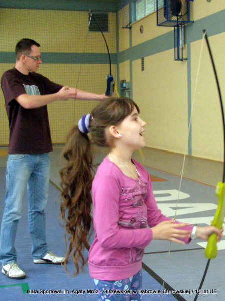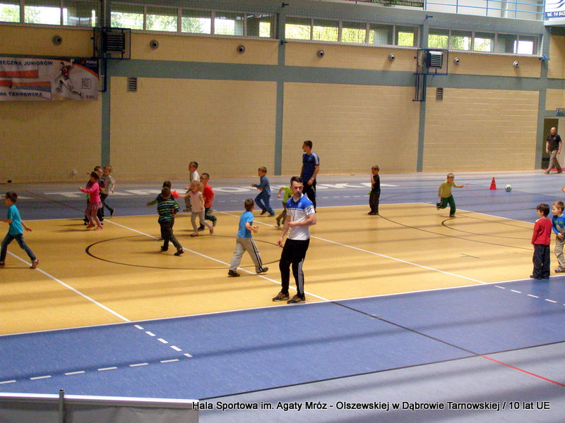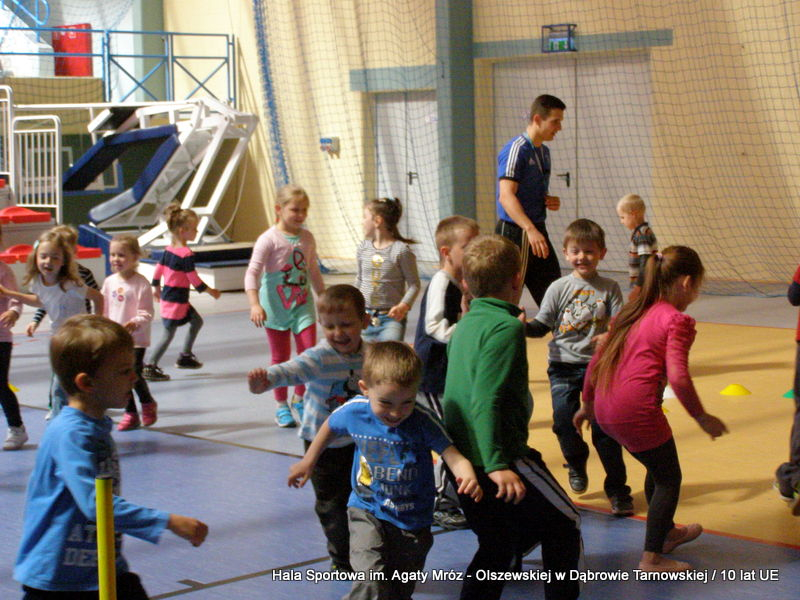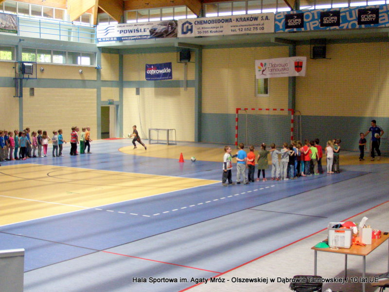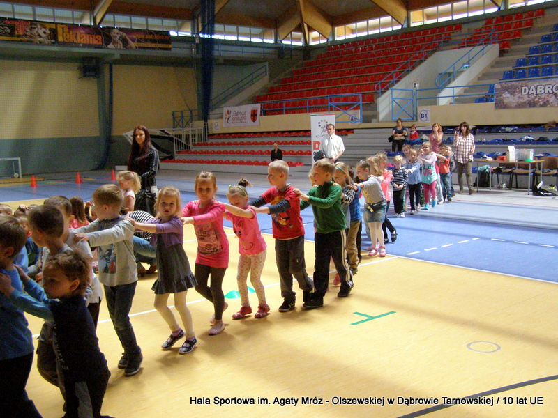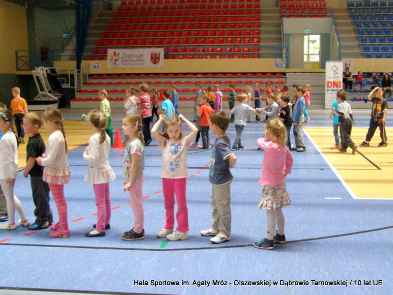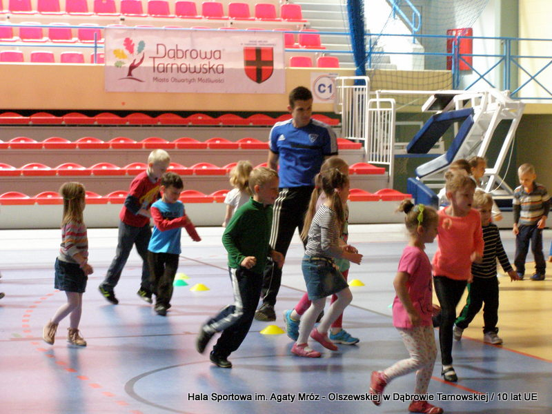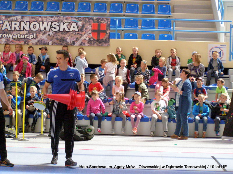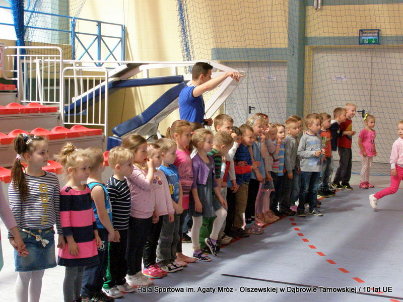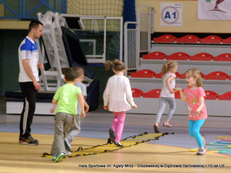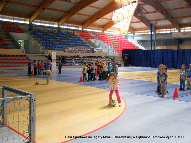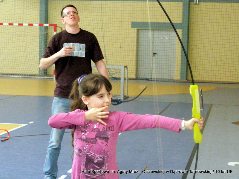 W niedzielę 11 maja przedszkolaki i starsze dzieci czekały wspaniałe atrakcje. Pracownica Referatu Kultury Fizycznej i Sportu Urzędu Miejskiego w Dąbrowie Tarnowskiej Anna Chmura przygotowała szereg zabaw i gier oraz specjalny tor z przeszkodami. Na zmęczonych czekała niesamowita niespodzianka w postaci puzzli, które przedstawiały obiekty w Dąbrowie Tarnowskiej, współfinansowane z funduszy Unii Europejskiej. Wiceprezes MLKS „Dąbrovia” Dawid Kot również miał przygotowane ciekawe zajęcia. Każda chętna osoba mogła zgłębić tajniki łucznictwa, spróbować strzelić do tarczy i zobaczyć z czym muszą zmierzyć się zawodnicy trenujący tę dyscyplinę sportu. Ponad to w godzinach 16:00 – 18:00 halę sportową można było zwiedzić. Chętne osoby zostały oprowadzone z przewodnikiem po miejscach które na co dzień są niedostępne, poznać historię budowy tego wspaniałego obiektu, jak również dowiedzieć się o najważniejszych imprezach sportowych które zostały przeprowadzone w Hali Sportowej im Agaty Mróz – Olszewskiej.
