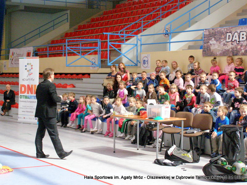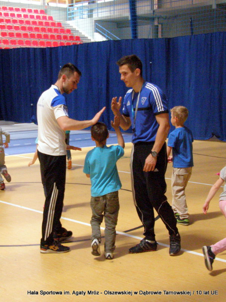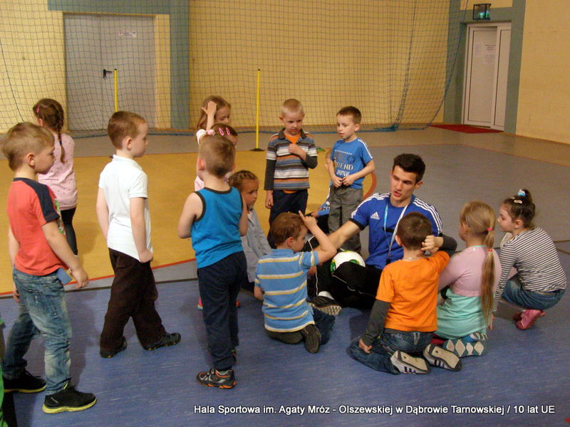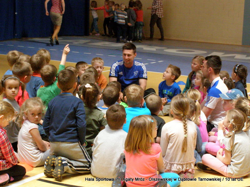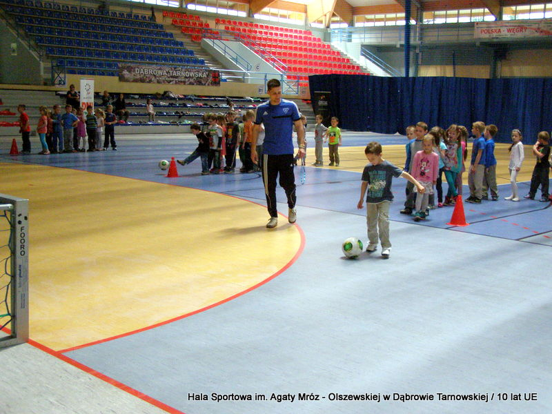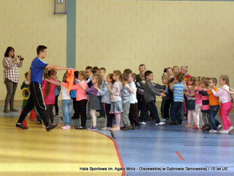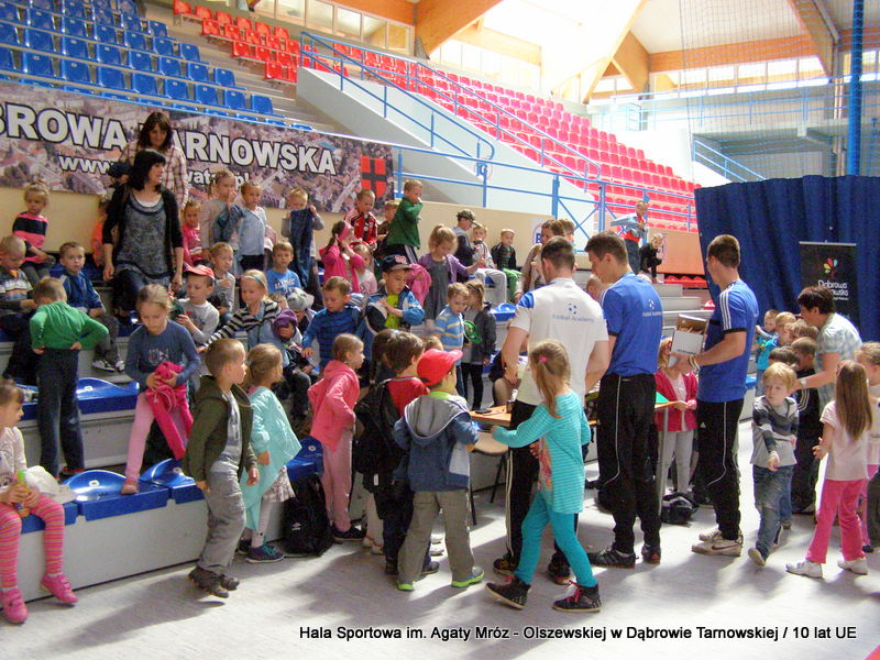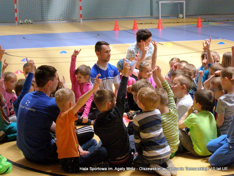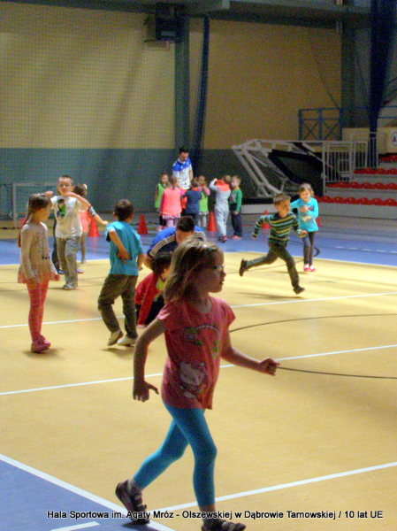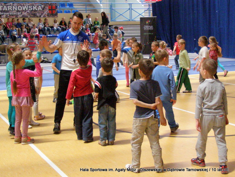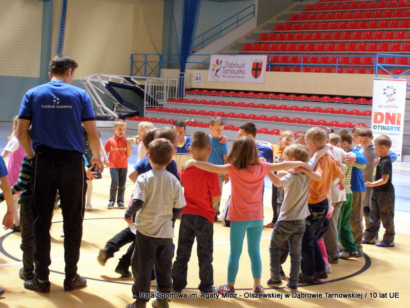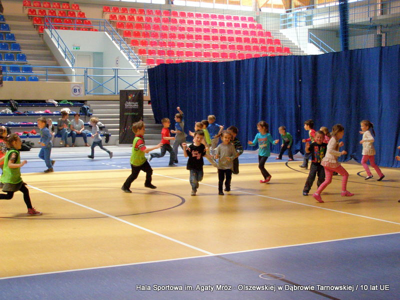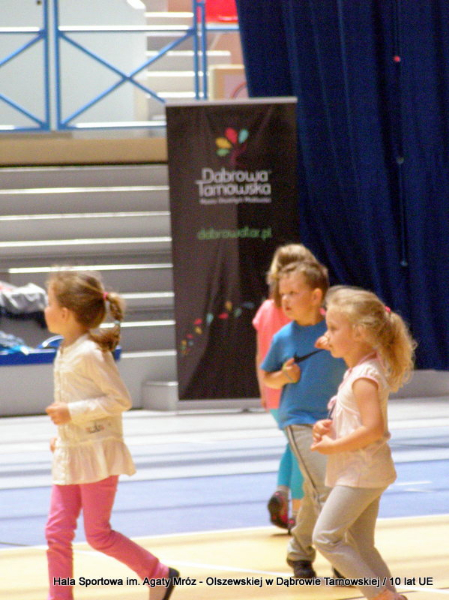 W niedzielę 11 maja przedszkolaki i starsze dzieci czekały wspaniałe atrakcje. Pracownica Referatu Kultury Fizycznej i Sportu Urzędu Miejskiego w Dąbrowie Tarnowskiej Anna Chmura przygotowała szereg zabaw i gier oraz specjalny tor z przeszkodami. Na zmęczonych czekała niesamowita niespodzianka w postaci puzzli, które przedstawiały obiekty w Dąbrowie Tarnowskiej, współfinansowane z funduszy Unii Europejskiej. Wiceprezes MLKS „Dąbrovia” Dawid Kot również miał przygotowane ciekawe zajęcia. Każda chętna osoba mogła zgłębić tajniki łucznictwa, spróbować strzelić do tarczy i zobaczyć z czym muszą zmierzyć się zawodnicy trenujący tę dyscyplinę sportu. Ponad to w godzinach 16:00 – 18:00 halę sportową można było zwiedzić. Chętne osoby zostały oprowadzone z przewodnikiem po miejscach które na co dzień są niedostępne, poznać historię budowy tego wspaniałego obiektu, jak również dowiedzieć się o najważniejszych imprezach sportowych które zostały przeprowadzone w Hali Sportowej im Agaty Mróz – Olszewskiej.