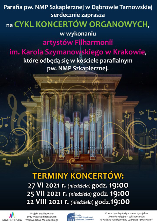 Parafia pw. NMP Szkaplerznej w Dąbrowie Tarnowskiej serdecznie zaprasza na Cykl Koncertów Ogranowych w wykonaniu artystów Filharmonii im. Karola Szymanowskiego w Krakowie, które odbędą się w kościele parafialnych pw. NMP Szkaplerznej w Dąbrowie Tarnowskiej. Pierwszy z trzech koncertów inauguracyjnych odbędzie się w niedzielę 27 czerwca br., a kolejne 25 lipca oraz 22 sierpnia. Wszystkie o godz. 19:00. Koncerty odbędą się w ramach projektu „Muzyka religijna – cykl koncertów w Kościele Parafialnym w Dąbrowie Tarnowskiej”.