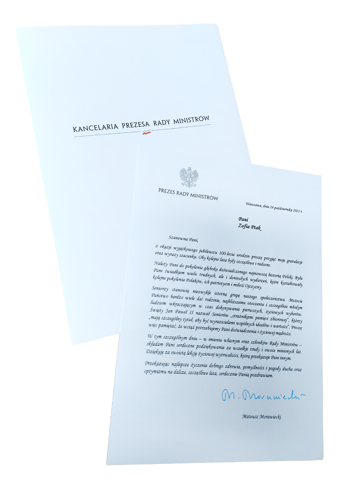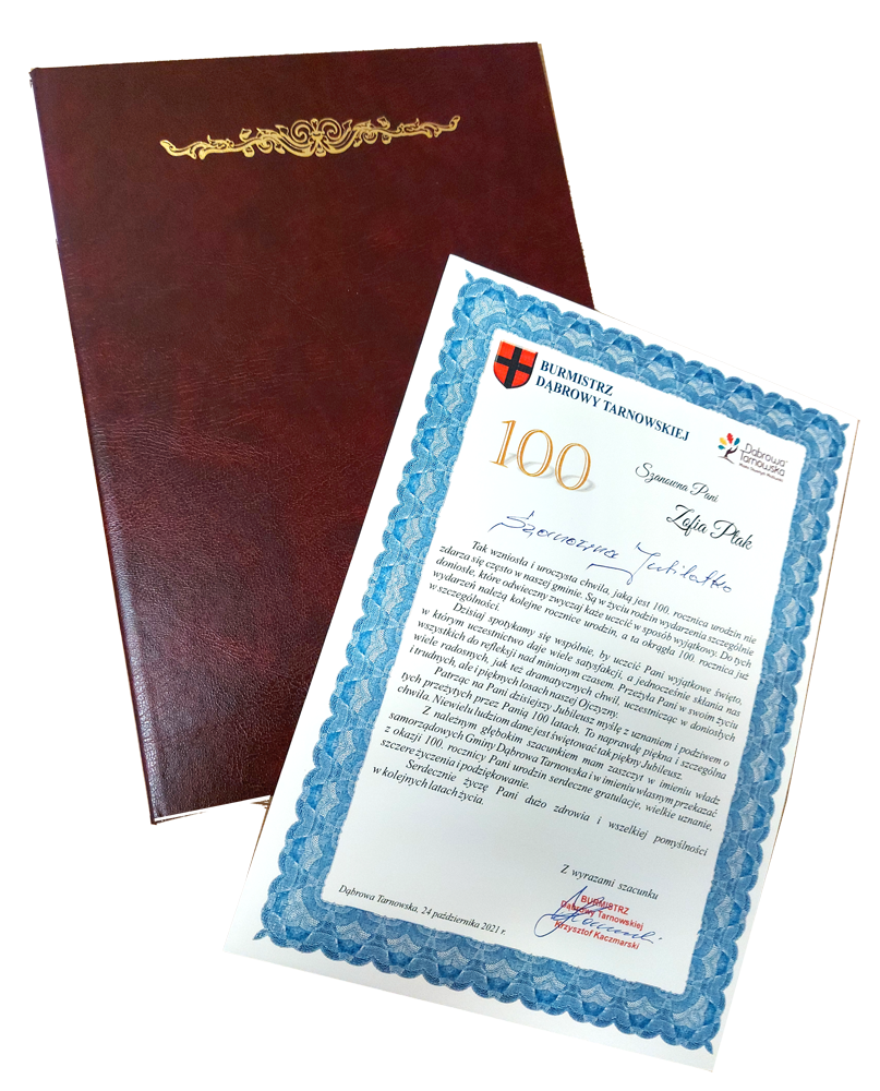Wyjątkowy jubileusz obchodziła mieszkanka Dąbrowy Tarnowskiej Pani Zofia Ptak, która 24 października świętowała setne urodziny. Z racji tego pięknego jubileuszu list gratulacyjny, kwiaty oraz upominek w imieniu władz gminy Dąbrowa Tarnowska na ręce rodziny Jubilatki przekazał Burmistrz Dąbrowy Tarnowskiej Pan Krzysztof Kaczmarski. Burmistrz wręczył również okolicznościowe życzenia od Prezesa Rady Ministrów Pana Mateusza Morawieckiego oraz Wojewody Małopolskiego Pana Łukasza Kmity. Pani Zofia Ptak rod. Kmieć urodziła się 24 października 1921 r. w Lipinach. W 1948 r. zawarła związek małżeński z Franciszkiem Ptak. Państwo Ptak wychowali 2 dzieci, a Pani Zofia doczekała się 6 wnuków i 12 prawnuków. Przez całe życie była niezwykle pogodną, zaradną, pracowitą i pomocną osobą. Na co dzień Pani Zofia mieszka z synem oraz synową, którzy troskliwie i z wielkim oddaniem opiekują się Dostojną Jubilatką, ponieważ od 10 lat zdrowie nie pozwala już pani Zofii opuszczać łóżka i wymaga stałej opieki.