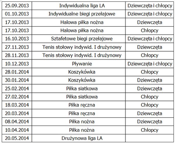 Z przyjemnością informujemy, że został ustalony ostateczny kalendarz gminnych imprez sportowych dla szkół podstawowych i gimnazjów na rok 2013/2014. Młodzież szkolną, nauczycieli i opiekunów zapraszamy do aktywnego udziału w zajęciach i współzawodnictwie sportowym. Głęboko wierzymy, że nasze propozycje zachęcą jak największą liczbę szkół do wzięcia udziału w sportowej rywalizacji oraz pozwolą na znalezienie przez każdego ucznia swojej ulubionej dyscypliny sportowej oraz atrakcyjnej formy aktywności fizycznej.