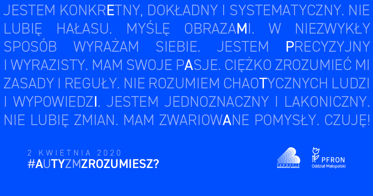 ZROZUM, POMÓŻ, AKCEPTUJ! #AuTYzmZROZUMIESZ? #mamAuTYzm Zachęcamy do śledzenia profilu Oddziału Małopolskiego PFRON na Facebook`u, gdzie będą pojawiać się kolejne informacje dotyczące kampanii: https://www.facebook.com/MalopolskiPFRON/