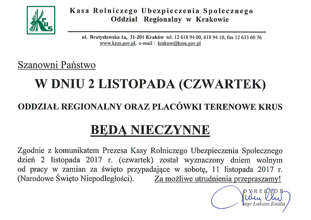 Kasa Rolniczego Ubezpieczania Społecznego informuje, że 2 listopada br. (tj. czwartek) Oddział Regionalny oraz Placówki Terenowe KRUS będą nieczynne. Zgodnie z komunikatem Prezesa Kasy Rolniczego Ubezpieczania Społecznego dzień 2-11-2017 został wyznaczony dniem wolnym od pracy w zamian za święto przypadające w sobotę, 11 listopada 2017 r. – Narodowe Święto Niepodległości.