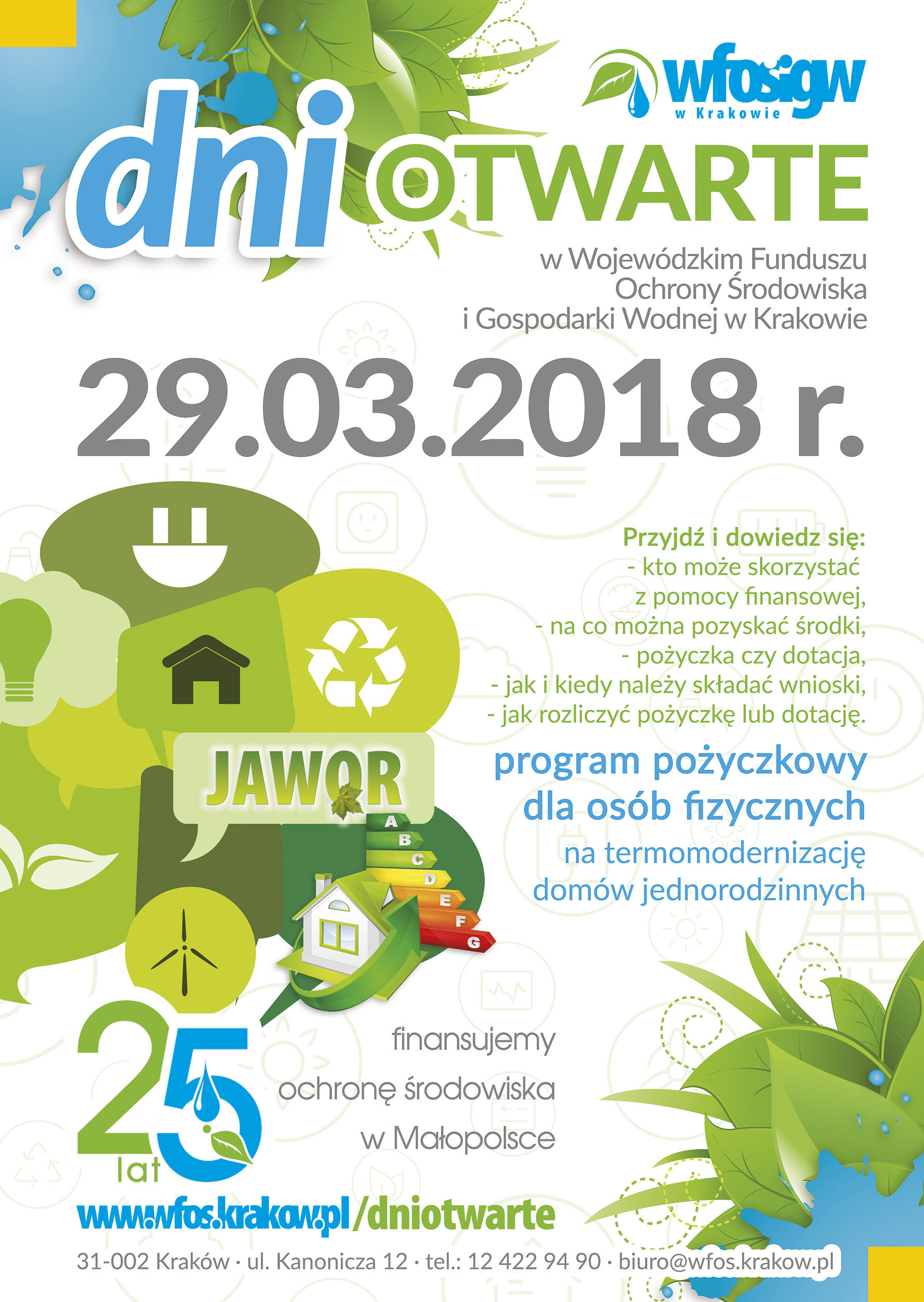 Wojewódzki Fundusz Ochrony Środowiska i Gospodarki Wodnej w Krakowie systematycznie organizuje akcję informacyjną pod hasłem Dni Otwarte, w ramach której zaprasza wszystkich obecnych i potencjalnych beneficjentów pomocy finansowej do siedziby WFOŚiGW w Krakowie (parter, ul. Kanonicza 12). Najbliższy termin Dni Otwartych – 29 marca 2018 r. W godzinach 8.00-15.00 pracownicy Funduszu są do Państwa pełnej dyspozycji. Odpowiedzą na wszystkie pytania, pomogą wypełnić wniosek, doradzą z jakich środków skorzystać i w jakich zakresach.