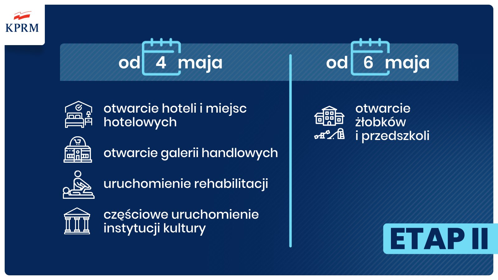 Wkraczamy w drugi zapowiadany etap znoszenia ograniczeń związanych z COVID-19. Po majówce otwarte zostaną centra handlowe, sklepy budowlane będą czynne w weekendy, a hotele wznowią działalność. To jednak nie koniec. Osoby chore powrócą do rehabilitacji, a biblioteki i instytucje kultury będą stopniowo otwierane po konsultacjach z sanepidem. Wprowadzamy także zmiany w funkcjonowaniu przedszkoli i żłobków. Co jeszcze zmieni się po długim weekendzie majowym? Powrót do normalności został podzielony na etapy. Całkowite odmrożenie gospodarki i życia codziennego Polaków zależy od rozwoju epidemii w kraju. Stale obserwujemy sytuację epidemiczną, analizujemy dynamikę przyrostu zachorowań, a także monitorujemy wydolność służby zdrowia. Na tej podstawie podejmujemy decyzję. Właśnie dlatego 4 maja 2020 r. przyspieszamy niektóre zmiany.