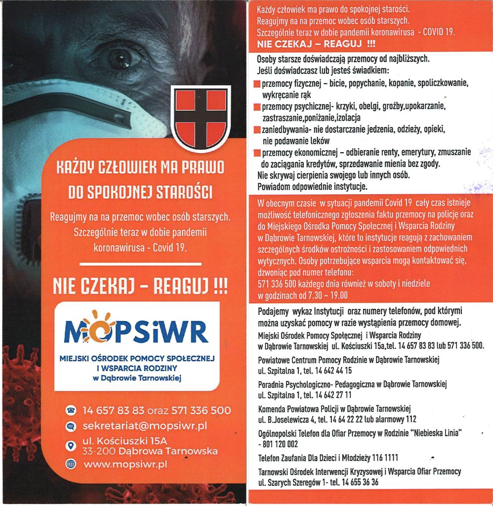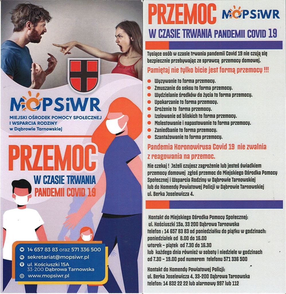 Zespół Interdyscyplinarny w Dąbrowie Tarnowskiej informuje, że w ostatnim czasie zostały przygotowane ulotki dotyczące problemu przemocy w rodzinie w czasie trwania pandemii COVID 19 oraz ulotki dotyczące przemocy wobec osób starszych również w czasie trwania pandemii COVID 19. Ulotki te zostaną rozprowadzone przez członków Zespołu Interdyscyplinarnego wśród mieszkańców miasta i gminy Dąbrowa Tarnowska w tym wśród osób starszych m.in. w Klubie Senior+ oraz w Uniwersytecie III Wieku. Zawarte w ulotkach informacje pozwolą na znalezienie odpowiedzi czym faktycznie jest przemoc w rodzinie, jakie są rodzaje przemocy oraz gdzie i na jaką pomoc może liczyć osoba doznająca przemocy w rodzinie w okresie trwania pandemii COVID 19.