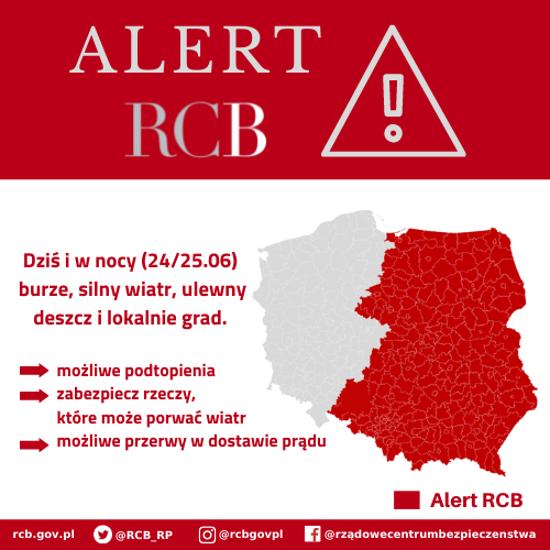 Uwaga! Od dziś do niedzieli (24-25.06) prognozowane burze z gradem, intensywne opady deszczu i silny wiatr. Możliwe podtopienia. Stosuj się do poleceń służb. Alert RCB o takiej treści został wysłany do mieszkańców województw: podkarpackiego, małopolskiego, świętokrzyskiego. Dla tego regionu kraju IMGW prognozuje burze z opadami gradu, intensywny deszcz i silny wiatr od 24 - 25 czerwca. Występowanie burz prognozowane jest przez cały dzień, a także w nocy. Może im towarzyszyć porywisty wiatr – do 110 km/h, grad oraz nawalne opady deszczu, które mogą powodować lokalne podtopienia.