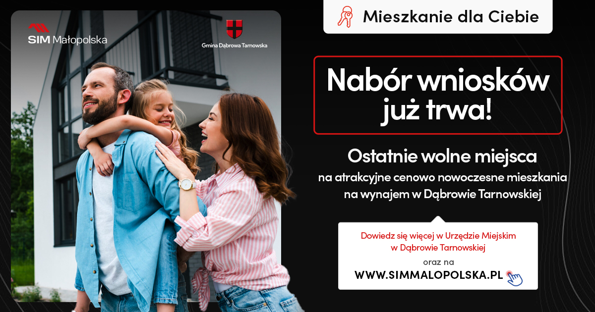 Informacja o ogłoszeniu naboru: https://old.dabrowatar.pl/rozpoczeto-nabor-wnioskow-o-zawarcie-umowy-najmu-lokali-mieszkalnych-w-ramach-sim-malopolska/