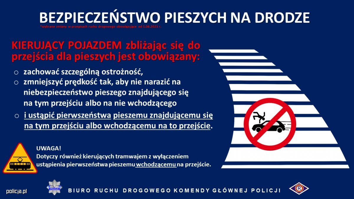 1 czerwca 2021 r. wchodzi w życie ustawa z dnia 25 lutego 2021 r. o zmianie ustawy – Prawo o ruchu drogowym (Dz.U. poz. 463), która wprowadza przepisy zwiększające bezpieczeństwo pieszych na drogach, ujednolica dopuszczalną prędkość na obszarze zabudowanym, a także obliguje kierujących pojazdami do zachowania minimalnego odstępu między pojazdami na autostradach i drogach ekspresowych. Zgodnie z nowymi przepisami, pieszy wchodzący na przejście dla pieszych będzie miał pierwszeństwo przed pojazdem, za wyjątkiem tramwaju. Przed tramwajem pieszy będzie miał pierwszeństwo tylko, gdy znajduje się już na przejściu dla pieszych.