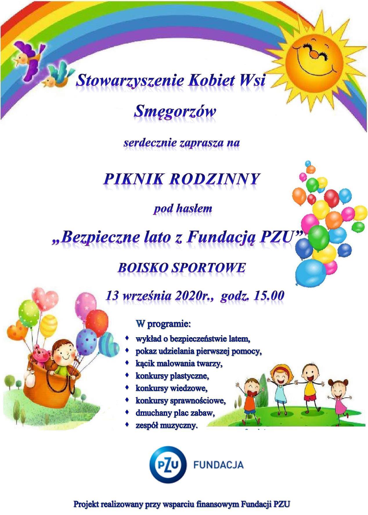 Stowarzyszenie Kobiet Wsi Smęgorzów organizuje pierwszą od kilku miesięcy imprezę plenerową. Już 13 września br. na stadionie sportowym odbędzie się piknik pod hasłem „Bezpieczne lato z Fundacją PZU”. Na uczestników czeka moc atrakcji: dmuchany plac zabaw, pokaz pierwszej pomocy, konkursy plastyczne, sprawnościowe i wiedzowe, malowanie twarzy, wata cukrowa,  popcorn, muzyka na żywo i wspólne biesiadowanie. Projekt realizowany jest w ramach partnerstwa z Fundacją PZU. W związku z trwającą epidemią, do udziału w imprezie zaproszeni są tylko mieszkańcy Smęgorzowa, przed wejściem na teren stadionu uczestnicy proszeni są o zdezynfekowanie dłoni i zachowanie bezpiecznego dystansu od innych.