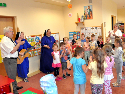 Dyrektor Ochronki siostra Marta Kołodziej zaprosiła burmistrza do kilku grup przedszkolnych. Podczas tej wizyty burmistrz złożył dzieciom życzenia, zapoznał się z pracą przedszkola oraz zaprosił do odwiedzin Urzędu Miejskiego. Dzieci w podziękowaniu za życzenia śpiewały piękne piosenki, którym akompaniowała grając na gitarze siostra Maria Kęder.