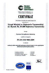 Certyfikat ISO 9001:2009 dla Urzędu Miejskiego w Dąbrowie Tarnowskiej
