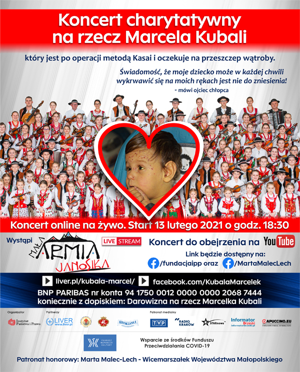 Aby przeżyć Marcel musi zgromadzić 8 mln złotych na przeszczep wątroby w Stanach Zjednoczonych. Dlatego 13 lutego o godzinie 18:30 dzięki uprzejmości księdza proboszcza Józefa Drabika odbędzie się w parafii NMP Matki Kościoła i św. Jakuba Apostoła w Brzesku koncert charytatywny w formule online na rzecz Marcela. Patronami medialnymi koncertu będą TVP, która przygotowuje materiał o Marcelu oraz Radio Kraków. W koncercie weźmie udział znany zespół dziecięcy „Mała Armia Janosika”. Link do obejrzenia koncertu będzie można znaleźć na mojej stronie facebookowej Marta Malec-Lech oraz na stronie facebookowej Fundacji Instytut Państwa i Prawa.