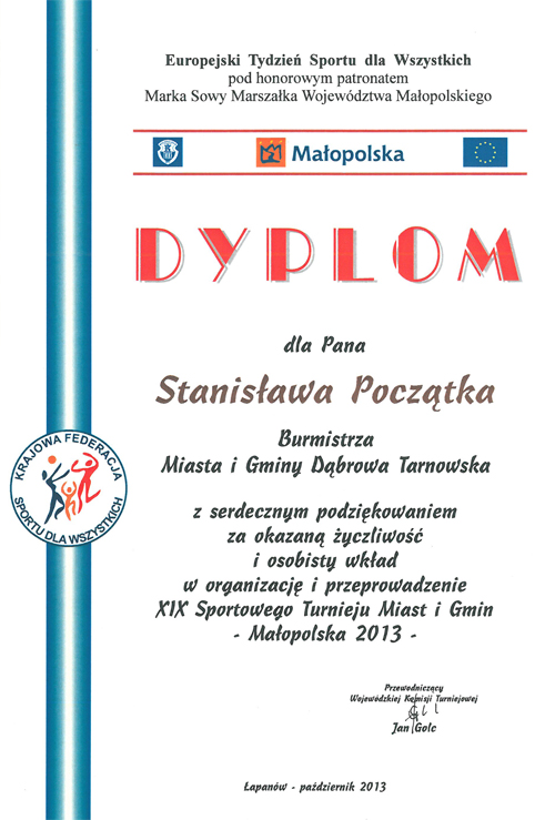 Otrzymane nagrody i wyróżnienia są dowodem na to, że Towarzystwo Krzewienia Kultury Fizycznej pozostaje pod dużym wrażeniem dąbrowskiej infrastruktury sportowej i działań gminy na rzecz popularyzacji aktywnego trybu życia wśród mieszkańców. Stworzona nakładem kilkudziesięciu milionów złotych infrastruktura sportowa oraz planowane w niedalekiej przyszłości kolejne inwestycje zaczynają przynosić zamierzony skutek. Stale rozbudowywane „kalendarze imprez” odbywających się zarówno w szkołach jak i na gminnych obiektach sportowych, a także rozwój nowych sekcji oraz poszerzanie wachlarza uprawianych dyscyplin sportowych w naszej gminie świadczą o tym, że Dąbrowa Tarnowska przywiązuje szczególną wagę do wszechstronnego rozwoju młodego pokolenia. Kapituła podkreślała też, że na dobry wynik w Sportowym Turnieju Miast i Gmin w Małopolsce wpłynęła sprawna organizacja Europejskiego Tygodnia Sportu dla Wszystkich, który miał miejsce na przełomie maja i czerwca 2013 roku. Burmistrz Dąbrowy Tarnowskiej i jego współpracownicy odpowiedzialni za infrastrukturę sportową i wypoczynkową otrzymali pisemne podziękowanie od Marszałka Województwa Małopolskiego Marka Sowy za wkład pracy w aktywizację ruchową Małopolan i otwartość na organizacje różnego rodzaju zmagań sportowych na terenie gminy.