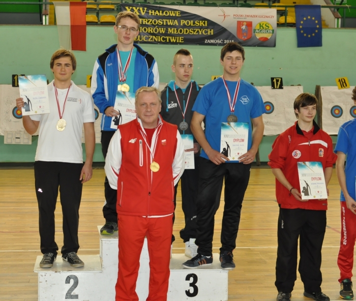 Zawody rozpoczęły się w piątek trzynastego i można byłoby tu pokusić się o pechowe przesądy, ale dla Grzegorza Wariasa to zbytnio nie miało znaczenia. Ta liczba mu się widocznie podoba, bo po kwalifikacjach właśnie na tej pozycji był sklasyfikowany, a następnie rozstawiony w drabince. Na początek poradził sobie w pojedynku z zawodnikiem „Agrosu” Zamość, następnie wyższość musiał uznać zawodnik z Poznania, a w ćwierćfinale z Żywca. Grzesiek w tym dniu świetnie strzelał. W półfinale czekał na niego kolega z reprezentacji województwa małopolskiego Dariusz Biela z „Płaszowianki” Kraków, który tydzień wcześniej w Dąbrowie Tarnowskiej na „Memoriale Trenerów” stał na podium. Obaj byli w znakomitej dyspozycji. Półfinał był zacięty, ale krótki. Dariusz rzadko kiedy się mylił i strzelał zazwyczaj dziesiątki wygrywając każdą rundę minimalnie o jeden punkt. Zawodnik „Dąbrovii” nie wszedł do finału jednak wrócił na tarczy, zaliczając bardzo wysoki awans z 13 lokaty. Grzegorz Warias zdobył brązowy medal i tytuł Halowego II Wicemistrza Polski Juniorów Młodszych na 2015 rok!!! To już kolejny medal i tytuł mistrzowski do kolekcji tego młodego łucznika.
