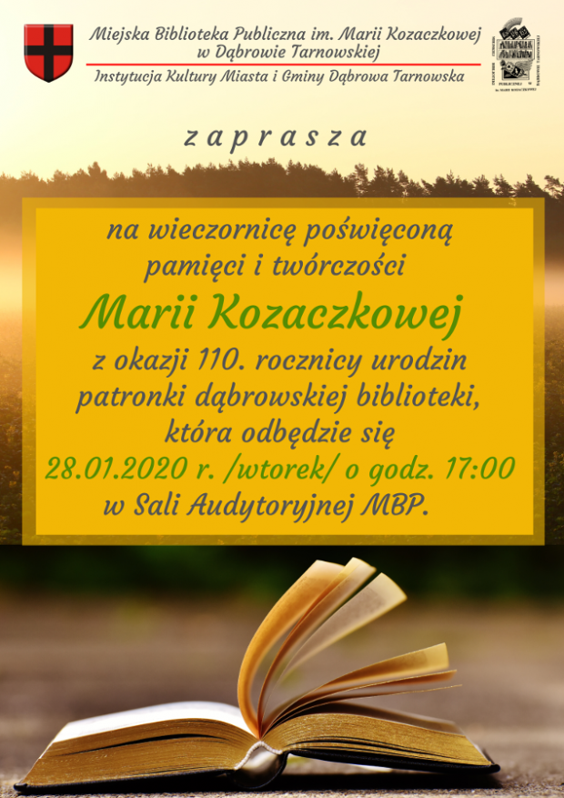 Plakat wieczornica MBP 2020 Dąbrowska biblioteka zaprasza na wieczornicę poświęconą pamięci i twórczości Marii KozaczkowejMaria Kozaczkowa urodziła się 28 stycznia 1910 roku w Zalipiu, "malowanej wsi" słynnej z pięknych kwiatów ozdabiających chaty, jako najmłodsza z pięciorga dzieci w rodzinie Wojtytów, gospodarujących na pięciu morgach ziemi. Ojca straciła w czasie pierwszej wojny światowej. Jemu to, jako dziewczynka, poświęciła swój pierwszy wiersz. W osiemnastym roku życia wyjechała do Bachowic, ówczesny powiat Oświęcim, na roczny kurs gospodarczy w Ludowej Żeńskiej Szkole Rolniczej Małopolskiego Towarzystwa Rolniczego. Ukończyła z bardzo dobrymi wynikami naukę obejmującą wiele przedmiotów. Tam dostrzeżono jej talent literacki i zaczęto umieszczać wiersze w "Młodej Polsce", która była dodatkiem do krakowskiego "Przewodnika Kółek Rolniczych". Wysyłała też swoje utwory do "Piasta" podpisując je  pseudonimem "Maryla znad Wisły". Wiele utworów poświęciła problematyce społecznej, etyczno-moralnej i religijnej, wyraźna jest liryka osobista, związana ze śmiercią matki i własnym sieroctwem.