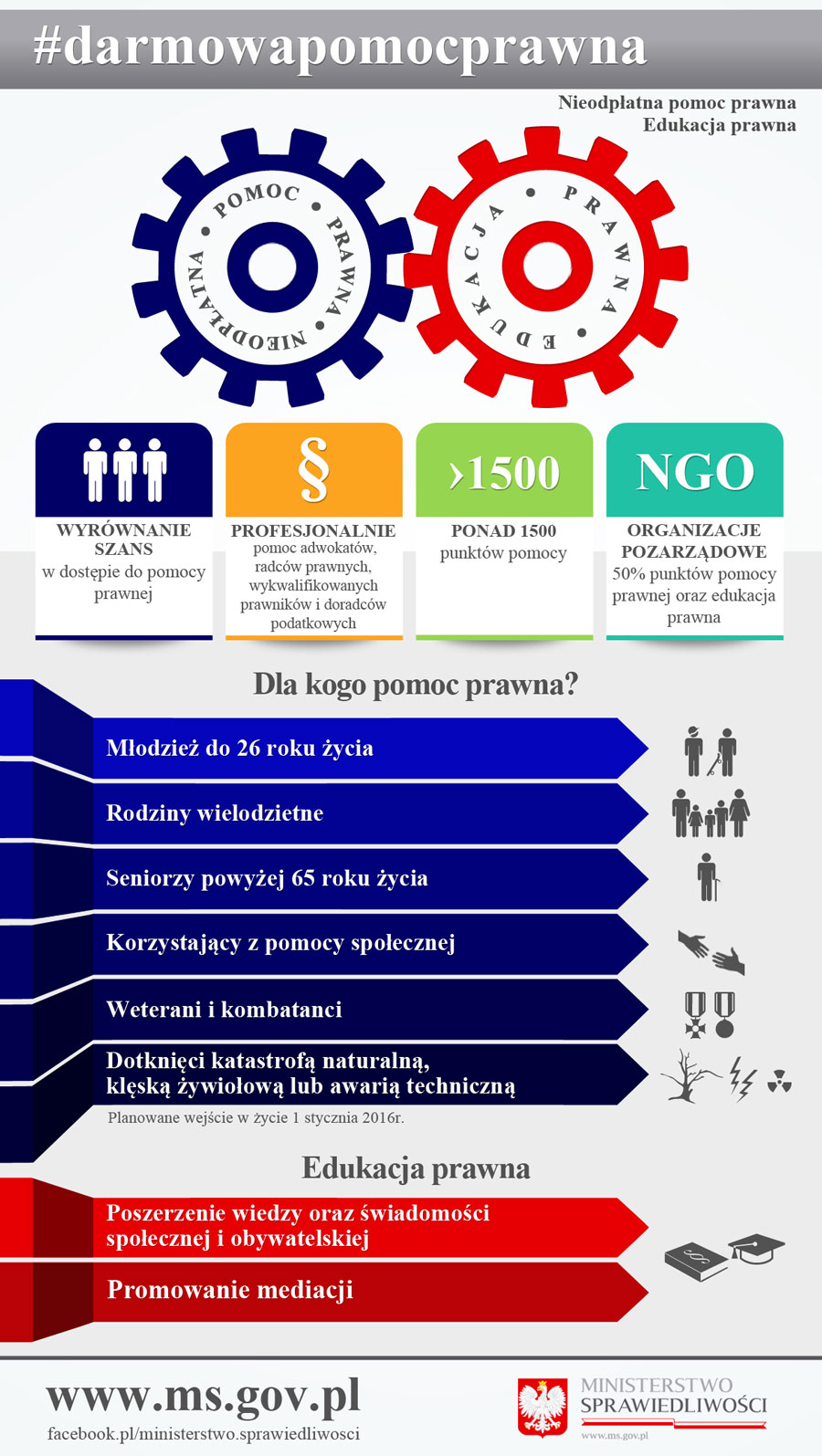 Od początku 2016 roku, na terenie całej Polski zacznie funkcjonować organizowana przez powiaty darmowa pomoc prawna. Jest to rezultat wejścia w życie ustawy z dnia 5 sierpnia 2015 r. o nieodpłatnej pomocy prawnej oraz edukacji prawnej, przygotowanej w Ministerstwie Sprawiedliwości. W całym kraju od stycznia 2016 r. powstanie ponad 1500 punktów, w których profesjonaliści będą świadczyć pomoc prawną. Dzięki współpracy rządu, samorządów i organizacji pozarządowych ogólnopolski system zagwarantuje nieodpłatny dostęp do porad prawnych na poziomie lokalnym i zniweluje zbyt często występującą w naszym kraju barierę finansową do korzystania z profesjonalnej usługi prawnej.