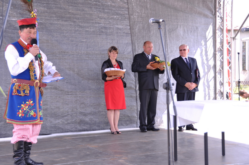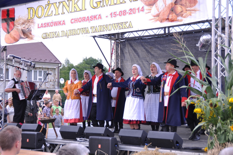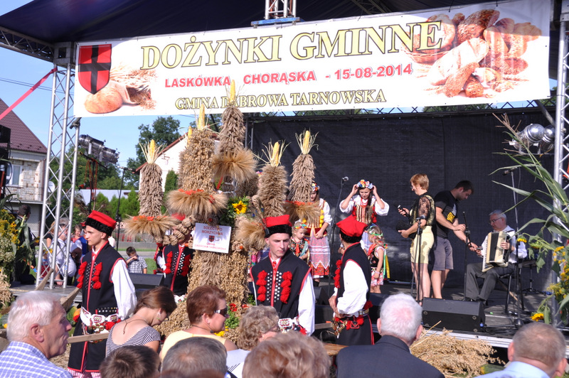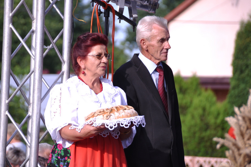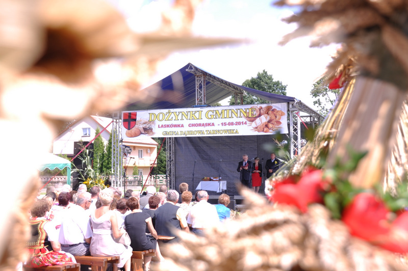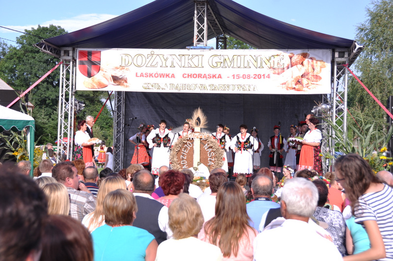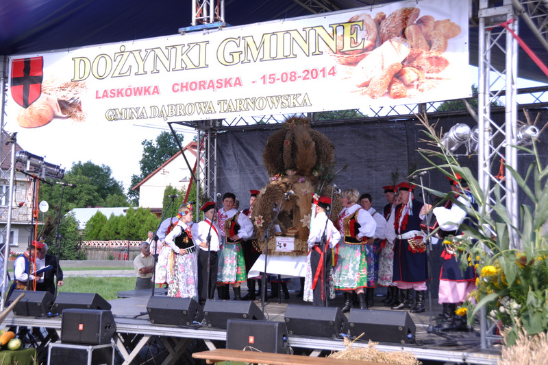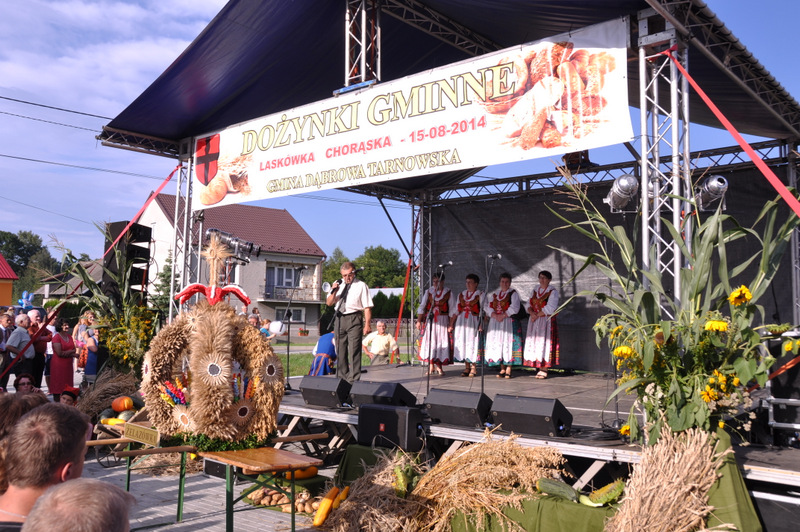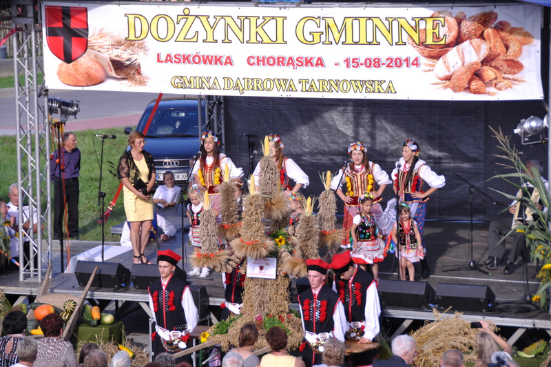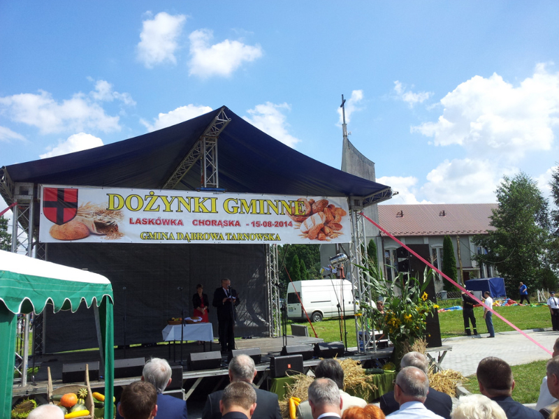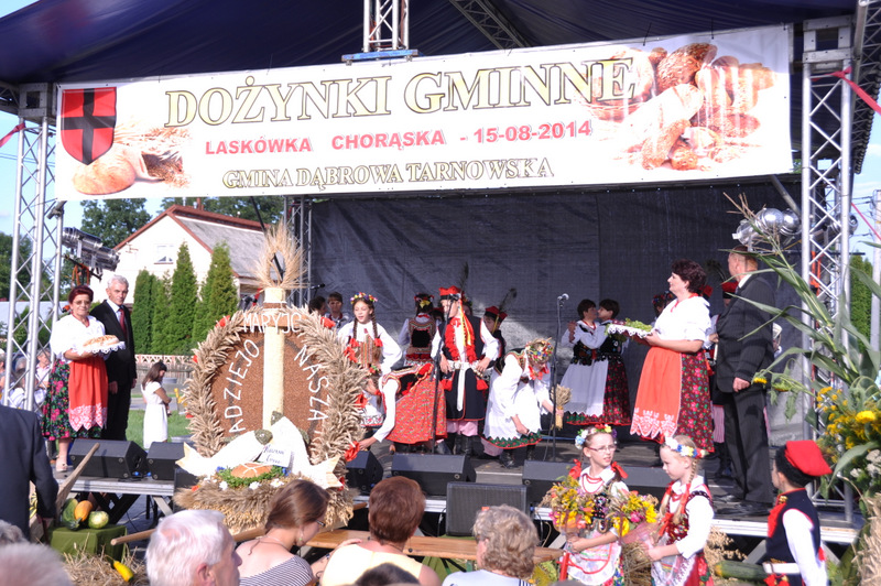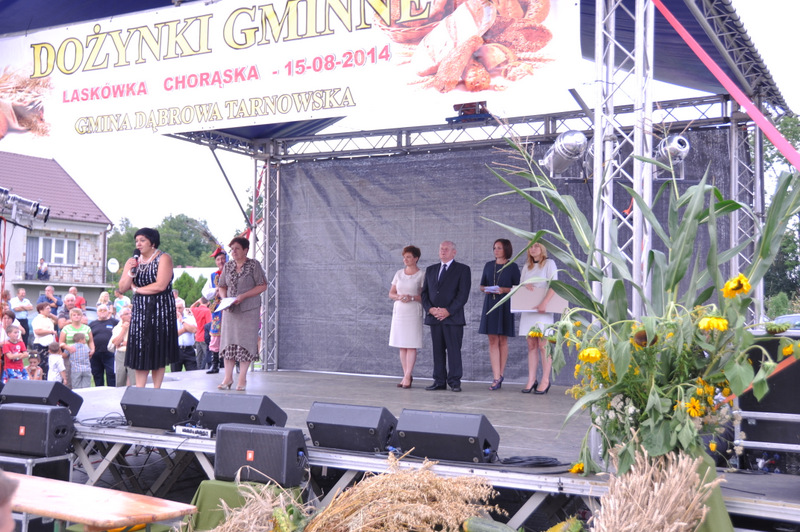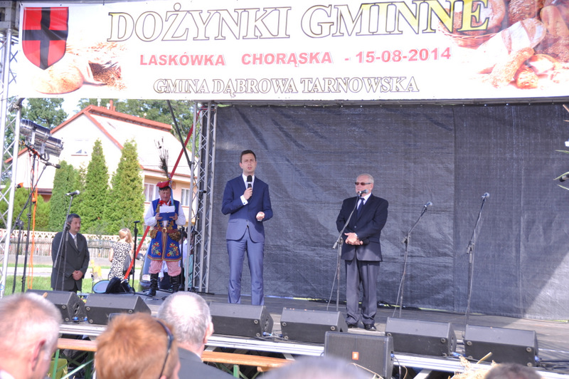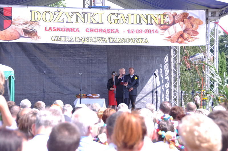 Druga część uroczystości dożynkowych odbyła się na parkingu przed nowym Domem Ludowym. Tu po odegraniu Hymnu Państwowego głos zabrali Państwo Starostowie Gminnych Dożynek. Starostami byli; Pani Agnieszka Masłoń z Laskówki Chorąskiej, która wraz z mężem prowadzi 30 ha gospodarstwo i Pan Jacek Świątek gospodarujący wraz z żoną na blisko 18 ha. Są oni mieszkańcami Laskówki Chorąskiej. Pan Jacek Świątek jest także drugą kadencję radnym Rady Miejskiej w Dąbrowie Tarnowskiej.