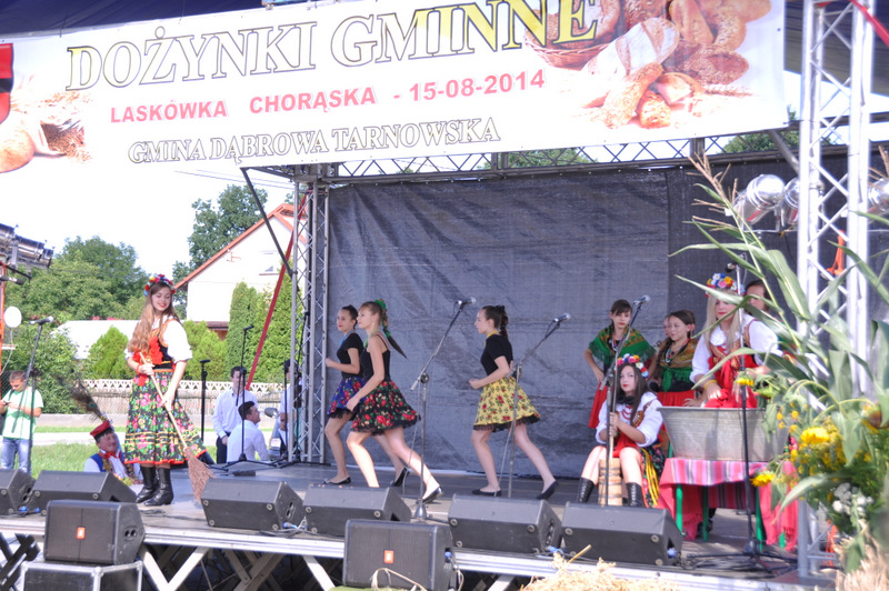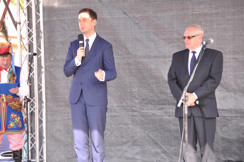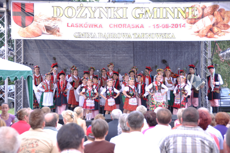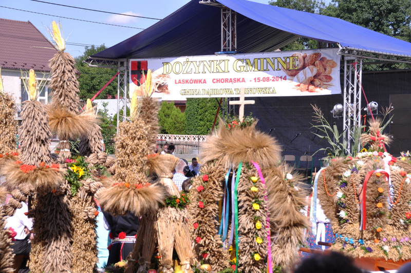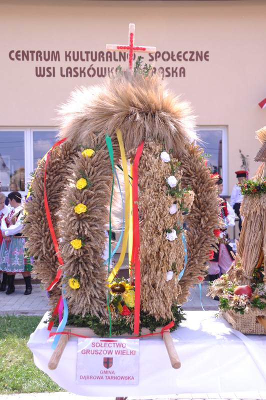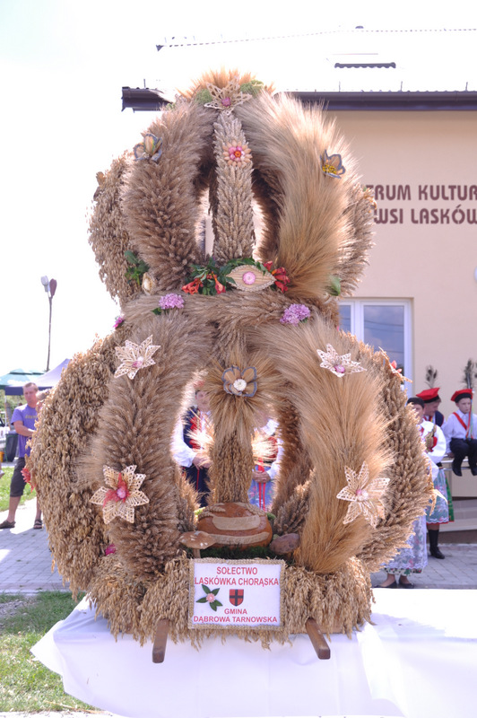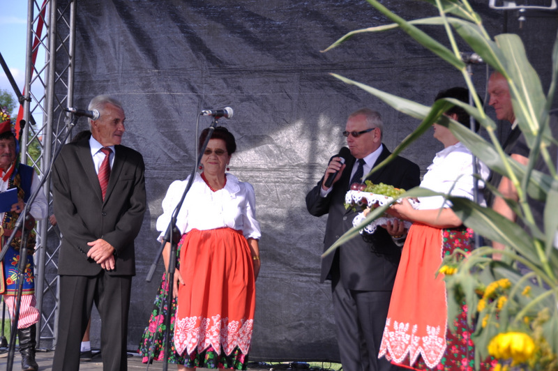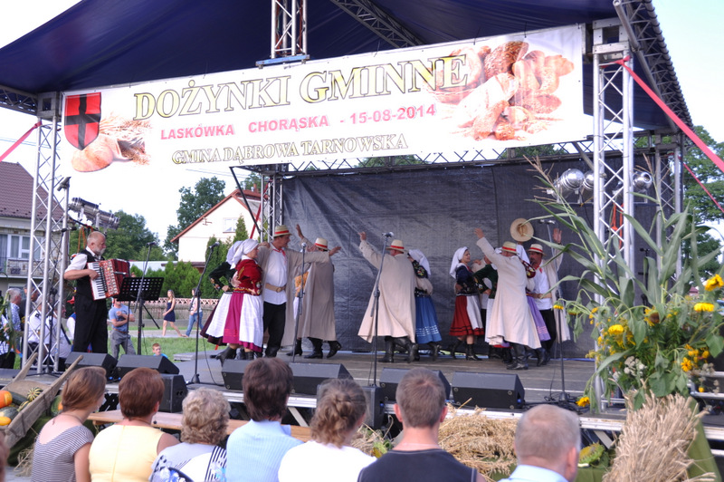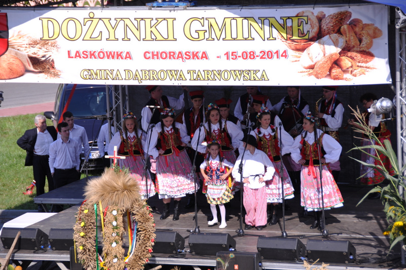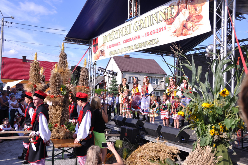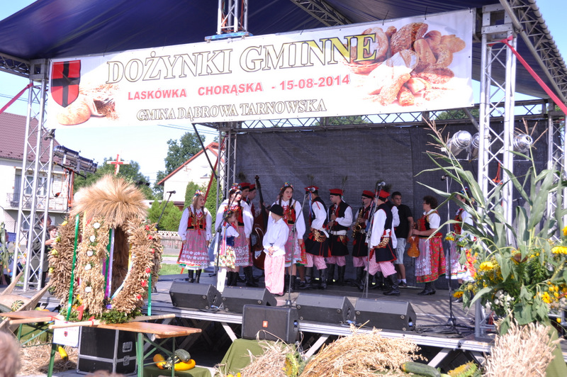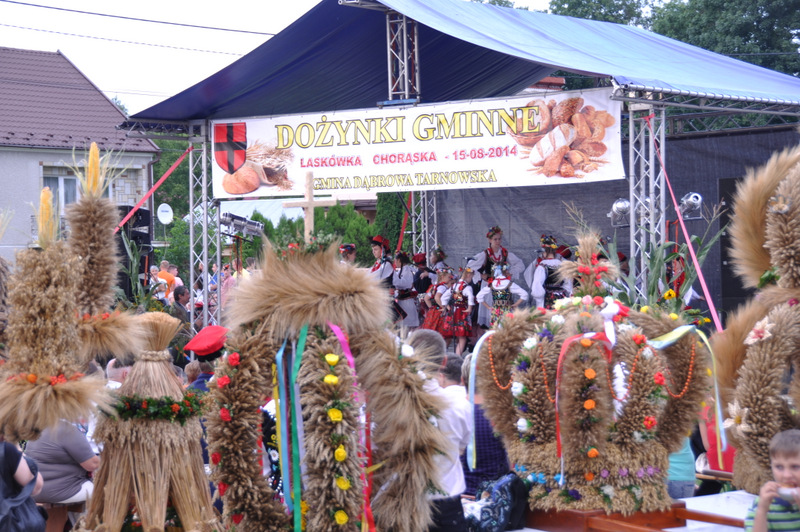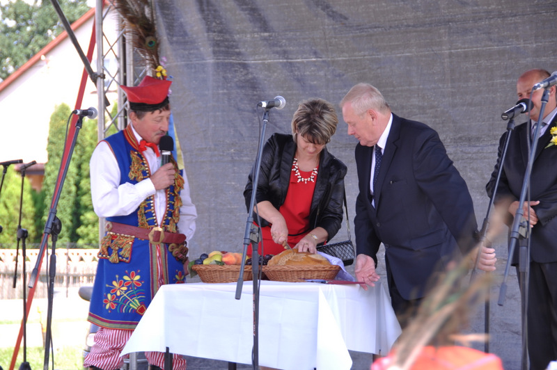 Druga część uroczystości dożynkowych odbyła się na parkingu przed nowym Domem Ludowym. Tu po odegraniu Hymnu Państwowego głos zabrali Państwo Starostowie Gminnych Dożynek. Starostami byli; Pani Agnieszka Masłoń z Laskówki Chorąskiej, która wraz z mężem prowadzi 30 ha gospodarstwo i Pan Jacek Świątek gospodarujący wraz z żoną na blisko 18 ha. Są oni mieszkańcami Laskówki Chorąskiej. Pan Jacek Świątek jest także drugą kadencję radnym Rady Miejskiej w Dąbrowie Tarnowskiej.