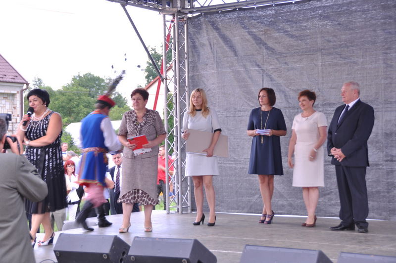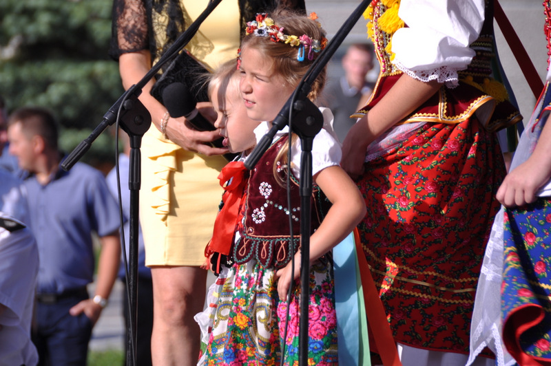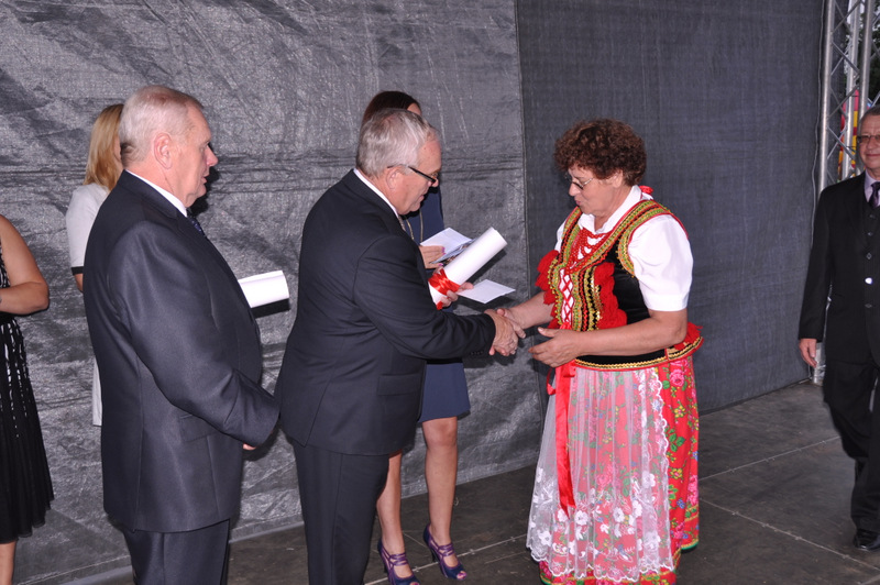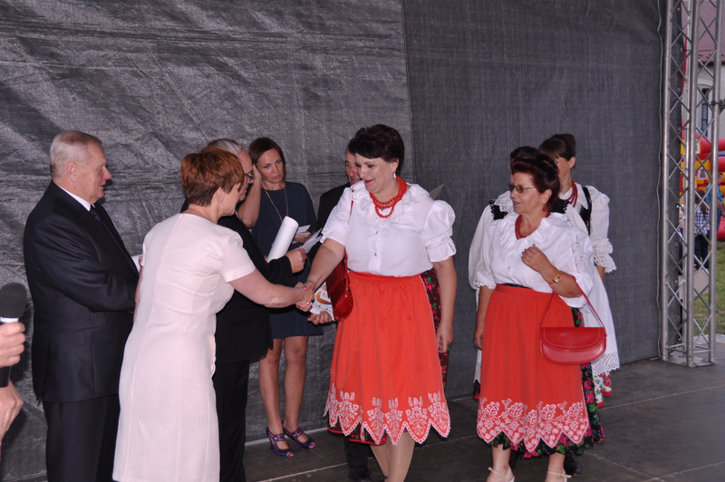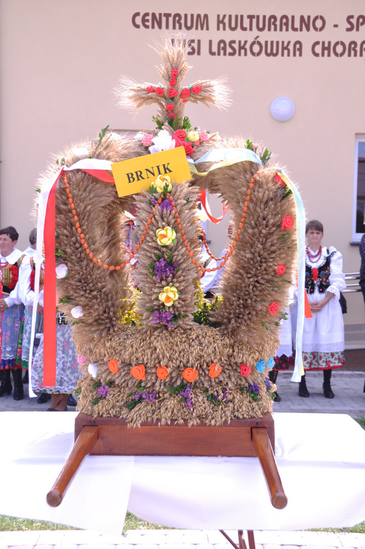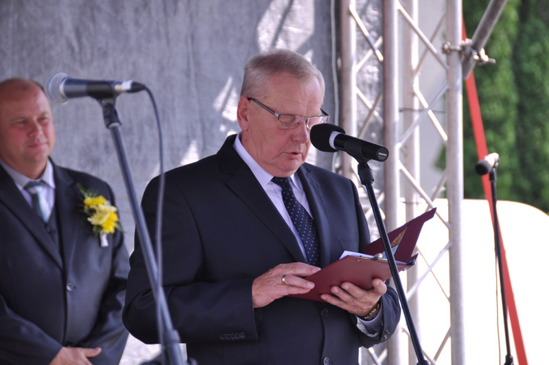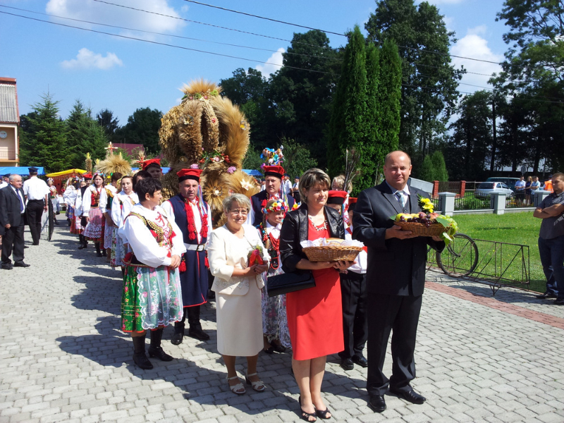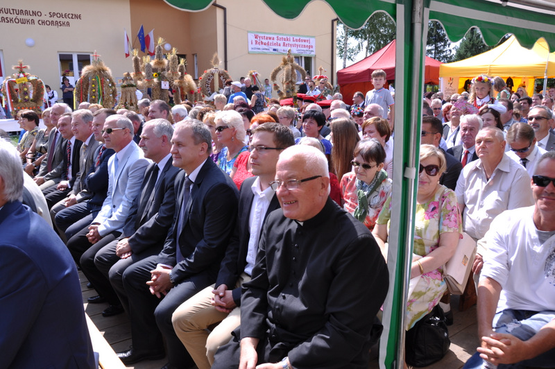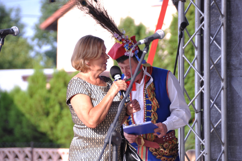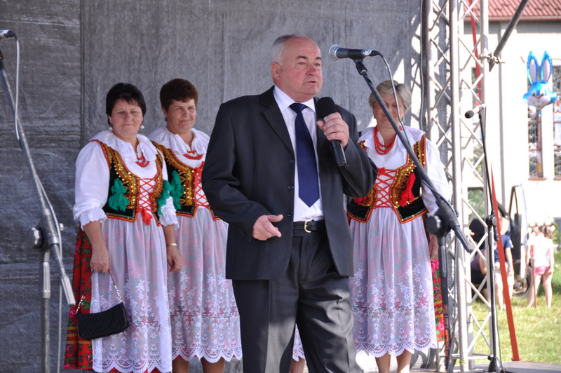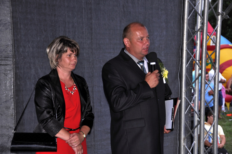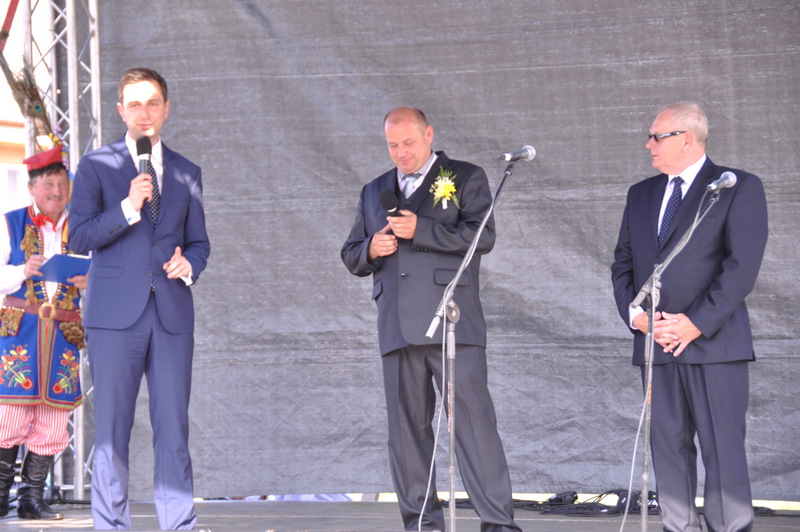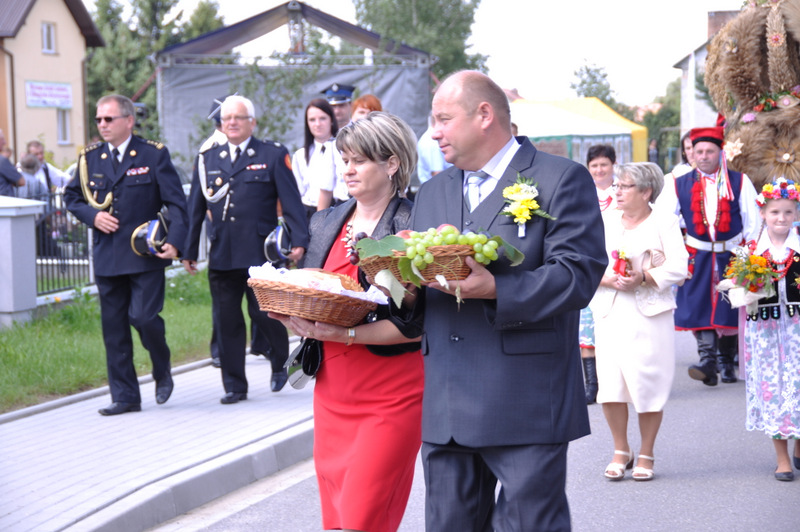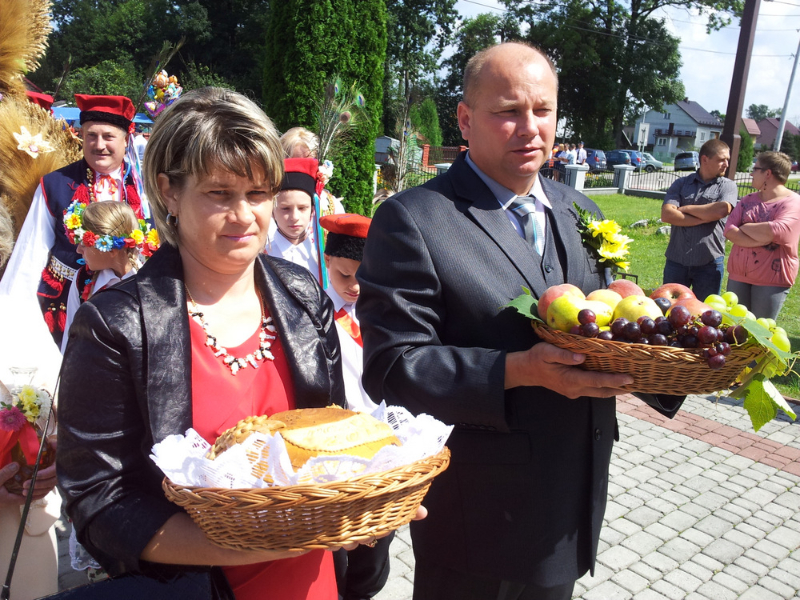 Druga część uroczystości dożynkowych odbyła się na parkingu przed nowym Domem Ludowym. Tu po odegraniu Hymnu Państwowego głos zabrali Państwo Starostowie Gminnych Dożynek. Starostami byli; Pani Agnieszka Masłoń z Laskówki Chorąskiej, która wraz z mężem prowadzi 30 ha gospodarstwo i Pan Jacek Świątek gospodarujący wraz z żoną na blisko 18 ha. Są oni mieszkańcami Laskówki Chorąskiej. Pan Jacek Świątek jest także drugą kadencję radnym Rady Miejskiej w Dąbrowie Tarnowskiej.