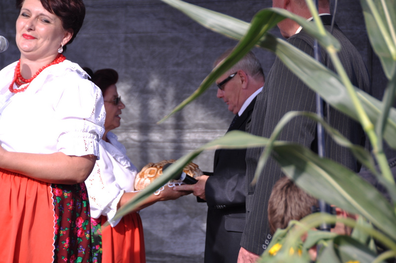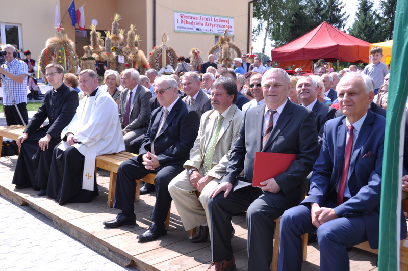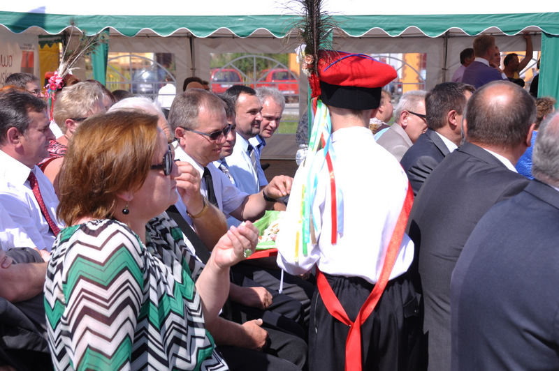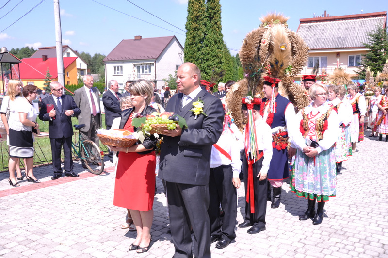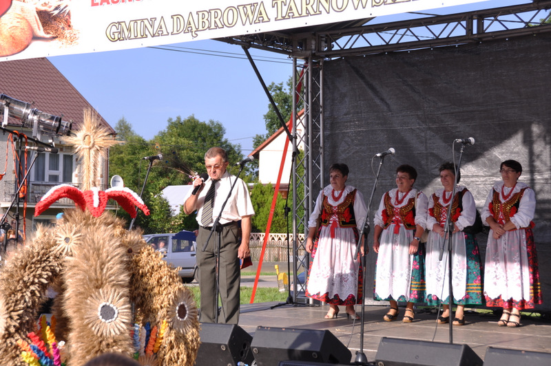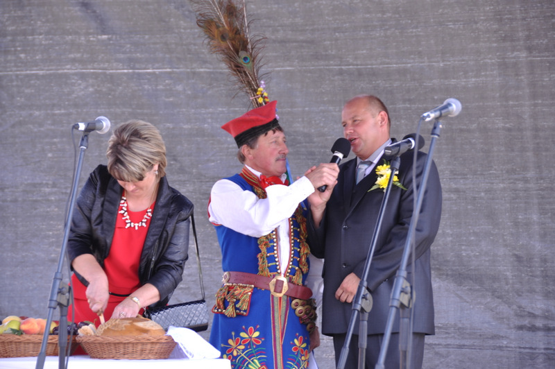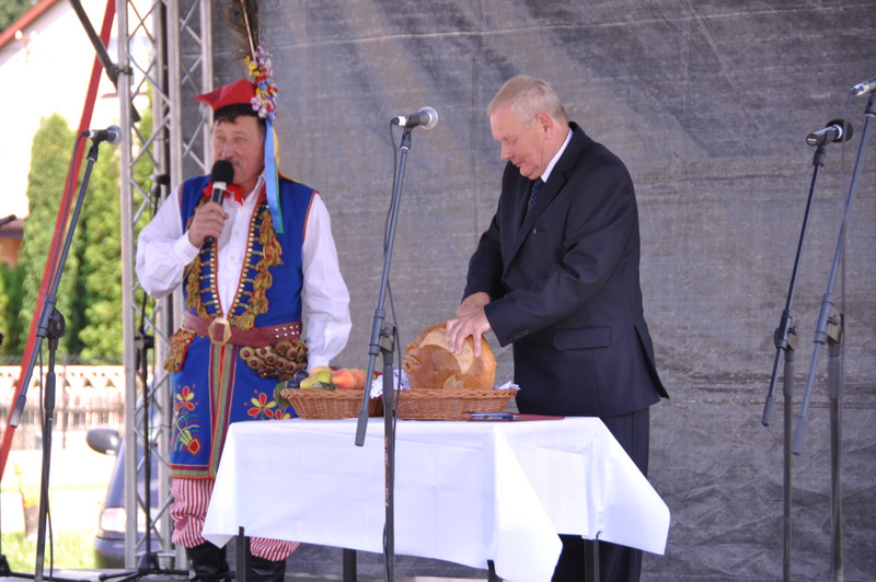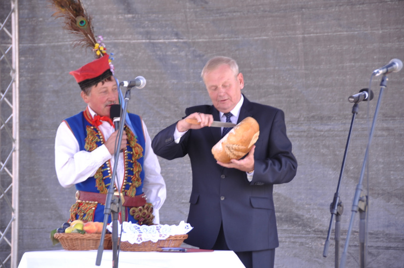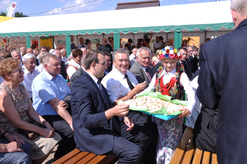 Starostowie po ogólnym powitaniu wręczyli wspaniały bochen chleba gospodarzowi gminy – Burmistrzowi Stanisławowi Początkowi. Burmistrz podziękował za ten wspaniały dar i obiecał dzielić chleb sprawiedliwie wśród mieszkańców 21 tysięcznej gminy Dąbrowa Tarnowska. Burmistrz powitał wszystkie delegacje sołeckie, poczty sztandarowe OSP i wymienił długą listę Gości wśród których byli m.in. Minister Pracy i Polityki Społecznej Władysław Kosiniak- Kamysz, Wiceprezes Centrali PFRON Marcin Horyń, Posłanka Urszula Augustyn, Poseł Józef Rojek, Poseł Jan Ziobro, Wicestarosta Dąbrowski Robert Pantera, Burmistrz Żabna Stanisław Kusior, Burmistrz Szczucina Jan Sipior, Wójt Gminy Mędrzechów Krzysztof Korzec, Radni Rady Powiatu Marian Gajda i Kazimierz Drożdżowski, Radni Rady Miejskiej na czele z Przewodniczącym Rady Władysławem Knutelskim i Wiceprzewodniczącym Stanisławem Królem, Komendant Powiatowy Policji insp. Andrzej Kupiec, Komendant Powiatowy Państwowej Straży Pożarnej st. bryg. Adam Rzemiński, p.o. Dyrektora ZOZ Łukasz Węgrzyn, Powiatowy Lekarz Weterynarii Jacek Janas, Wiceprezes Zarządu Wojewódzkiego Związku OSP druh Ryszard Pikul, Prezes MLKS Dąbrovia Piotr Zając, Dyrektor Biblioteki Powiatowej Ewa Drzazga, Dyrektor ZSP Nr 2 Jan Kiljan, Doradca Starosty Krzysztof Michalak, Dyrektor ZSP w Brniu Jarosław Boryczka, Prezes Uniwersytetu Trzeciego Wieku Krystynę Guzik i Wiceprezes Małgorzatę Majchrowicz. Szef gminy powitał też swoich współpracowników; Zastępcę Burmistrza Marka Minorczyka, Skarbnika Gminy Małgorzatę Bąba, Sekretarza Gminy Stanisława Ryczka, Dyrektora Dąbrowskiego Domu Kultury Pawła Chojnowskiego, Dyrektor Miejskiej Biblioteki Publicznej Jadwigę Kusior, Zastępcę Dyrektora MGOPS Halinę Sarat, Dyrektora Gminnego Zakładu Gospodarki Komunalnej Zbigniewa Kwiatkowskiego, Dyrektora SGZOZ w Dąbrowie Tarnowskiej Stanisława Świętka oraz wielu innych.