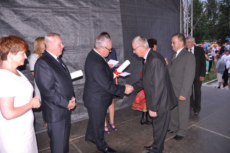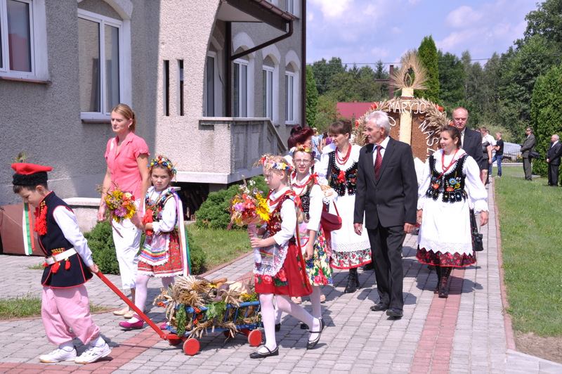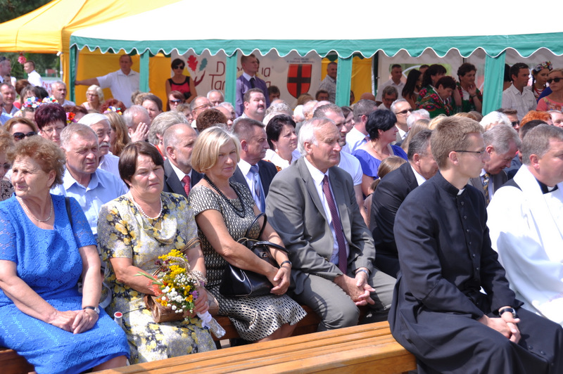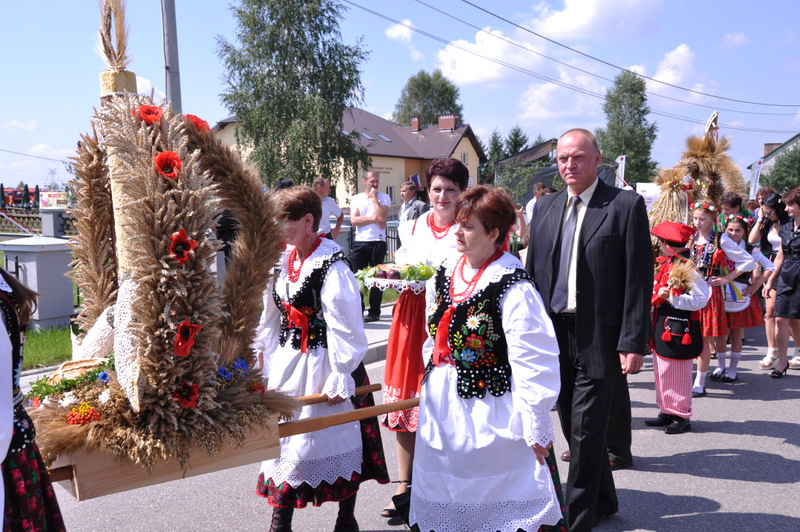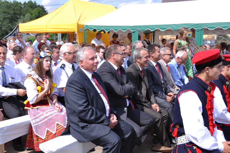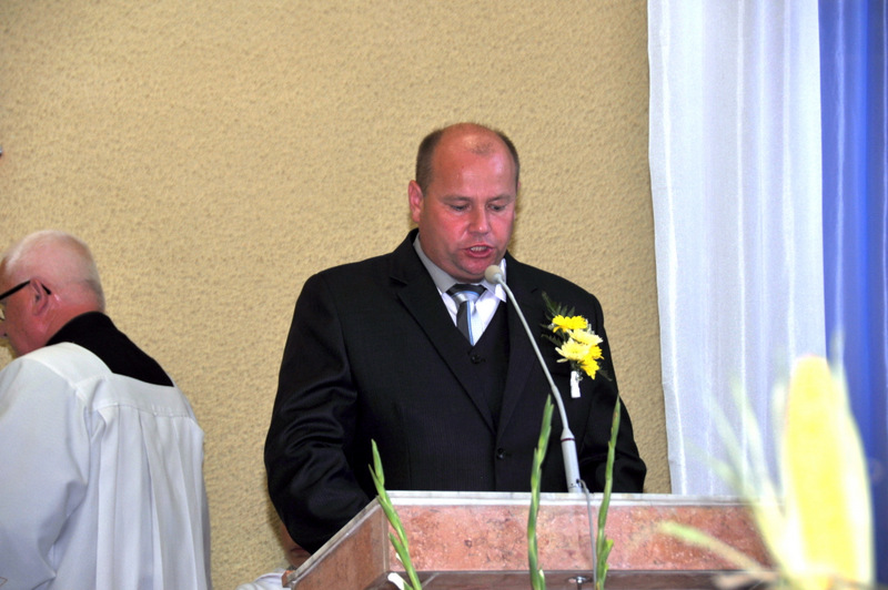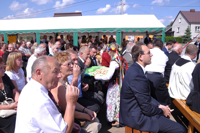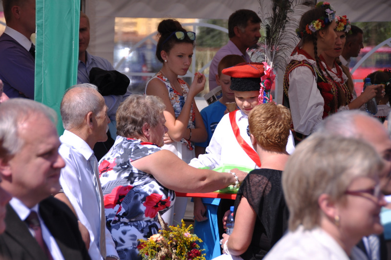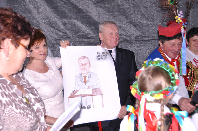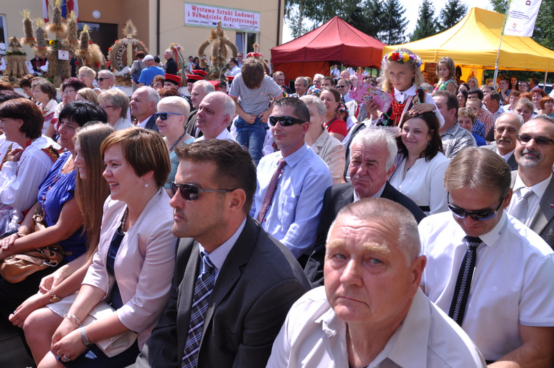 Starostowie po ogólnym powitaniu wręczyli wspaniały bochen chleba gospodarzowi gminy – Burmistrzowi Stanisławowi Początkowi. Burmistrz podziękował za ten wspaniały dar i obiecał dzielić chleb sprawiedliwie wśród mieszkańców 21 tysięcznej gminy Dąbrowa Tarnowska. Burmistrz powitał wszystkie delegacje sołeckie, poczty sztandarowe OSP i wymienił długą listę Gości wśród których byli m.in. Minister Pracy i Polityki Społecznej Władysław Kosiniak- Kamysz, Wiceprezes Centrali PFRON Marcin Horyń, Posłanka Urszula Augustyn, Poseł Józef Rojek, Poseł Jan Ziobro, Wicestarosta Dąbrowski Robert Pantera, Burmistrz Żabna Stanisław Kusior, Burmistrz Szczucina Jan Sipior, Wójt Gminy Mędrzechów Krzysztof Korzec, Radni Rady Powiatu Marian Gajda i Kazimierz Drożdżowski, Radni Rady Miejskiej na czele z Przewodniczącym Rady Władysławem Knutelskim i Wiceprzewodniczącym Stanisławem Królem, Komendant Powiatowy Policji insp. Andrzej Kupiec, Komendant Powiatowy Państwowej Straży Pożarnej st. bryg. Adam Rzemiński, p.o. Dyrektora ZOZ Łukasz Węgrzyn, Powiatowy Lekarz Weterynarii Jacek Janas, Wiceprezes Zarządu Wojewódzkiego Związku OSP druh Ryszard Pikul, Prezes MLKS Dąbrovia Piotr Zając, Dyrektor Biblioteki Powiatowej Ewa Drzazga, Dyrektor ZSP Nr 2 Jan Kiljan, Doradca Starosty Krzysztof Michalak, Dyrektor ZSP w Brniu Jarosław Boryczka, Prezes Uniwersytetu Trzeciego Wieku Krystynę Guzik i Wiceprezes Małgorzatę Majchrowicz. Szef gminy powitał też swoich współpracowników; Zastępcę Burmistrza Marka Minorczyka, Skarbnika Gminy Małgorzatę Bąba, Sekretarza Gminy Stanisława Ryczka, Dyrektora Dąbrowskiego Domu Kultury Pawła Chojnowskiego, Dyrektor Miejskiej Biblioteki Publicznej Jadwigę Kusior, Zastępcę Dyrektora MGOPS Halinę Sarat, Dyrektora Gminnego Zakładu Gospodarki Komunalnej Zbigniewa Kwiatkowskiego, Dyrektora SGZOZ w Dąbrowie Tarnowskiej Stanisława Świętka oraz wielu innych.