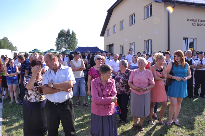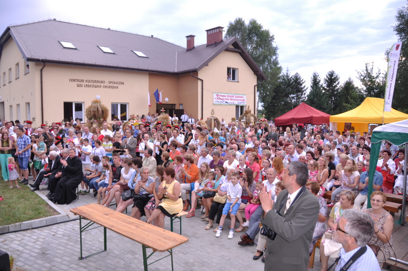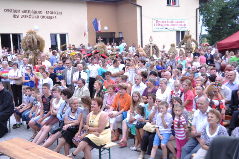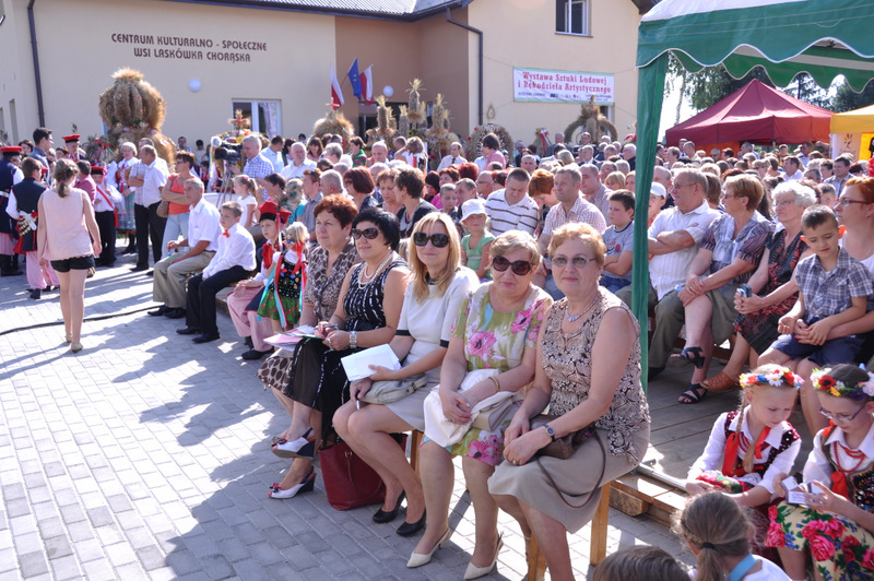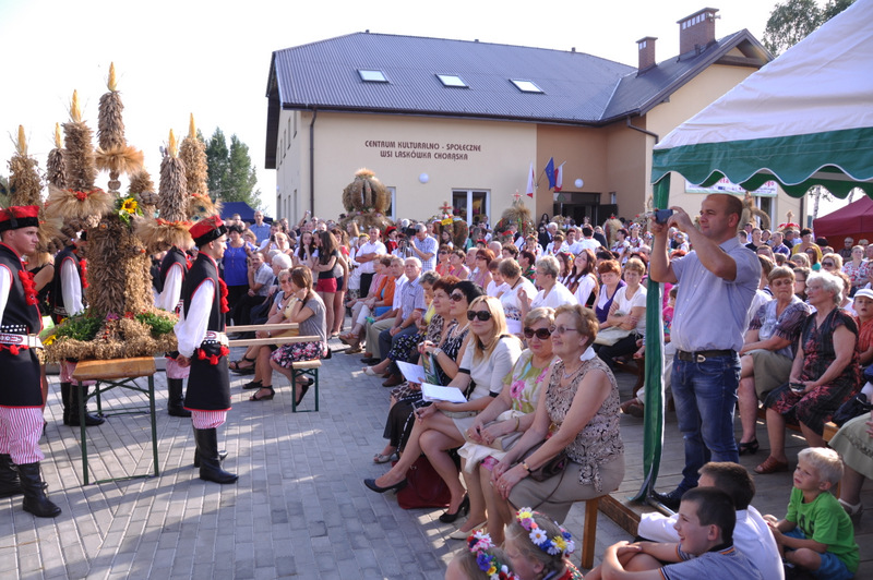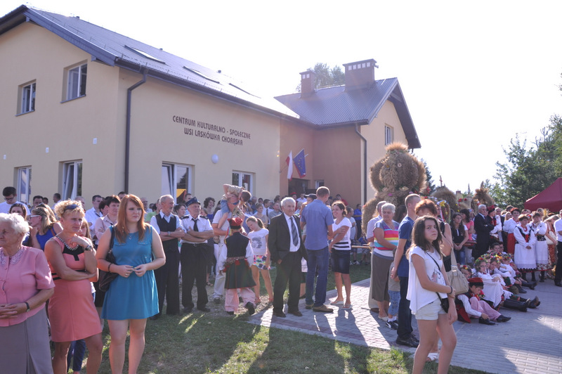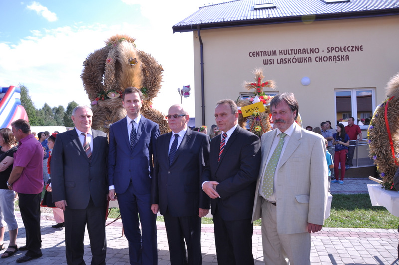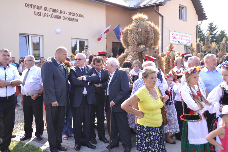 W trakcie przemówienia Burmistrz nawiązał do też do zadań realizowanych przez dąbrowski samorząd gminny i powiedział m.in. “Nasz samorząd dba o zrównoważony rozwój wszystkich sołectw i miasta. I tak jest od kilku kadencji. Dowodem na to są setki kilometrów wodociągów, kanalizacji, dróg. To także dbałość o budynki szkolne, remizy strażackie, obiekty sportowe i kulturalne a także zabytki. Dzisiejsza uroczystość dożynkowa zbiega się z oficjalnym i uroczystym przekazaniem do użytku nowego Domu Ludowego (Centrum Społeczno - Kulturalnego ) w Laskówce Chorąskiej. Budynek zaprojektował mgr. inż. Witold Chudy, który na kolejnym etapie nadzorował realizację inwestycji. Wykonawcą była Firma ARKADA z Mielca, której Prezesem jest Andrzej Padykuła. Budynek ma 280 m 2 powierzchni użytkowej i posiada salę zebrań, pomieszczenia do gier zręcznościowych i rekreacyjnych, pracownię komputerową z doprowadzonym internetem, kuchnię i pomieszczenia socjalne. Budynek jest przystosowany także dla potrzeb osób niepełnosprawnych. Całkowity koszt budowy i wyposażenia wyniósł 1.074.000 zł z czego 500.000 zł stanowi dotacja europejska z Programu Rozwoju Obszarów Wiejskich na lata 2007- 2013.” Za tę dotację Burmistrz podziękował Zarządowi Województwa Małopolskiego. Pozostała kwota została sfinansowana ze środków własnych gminy Dąbrowa Tarnowska.”