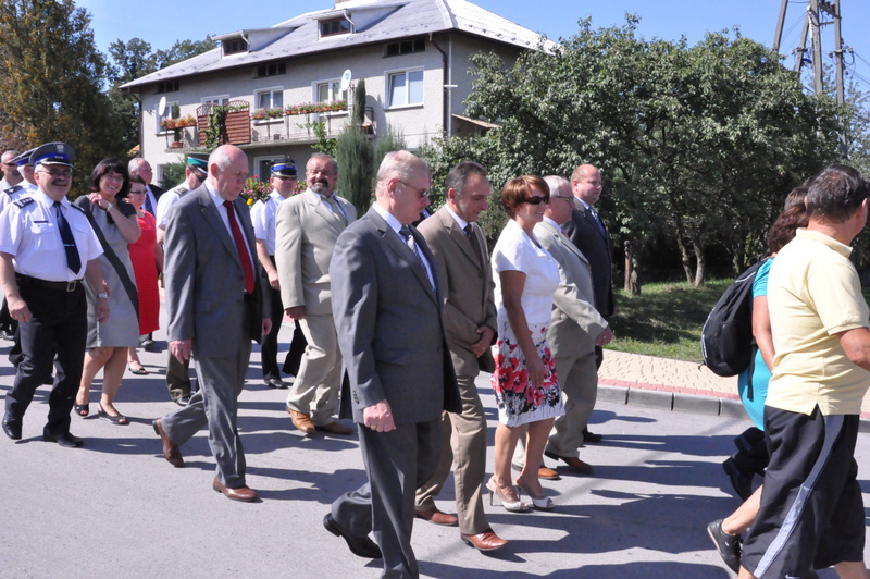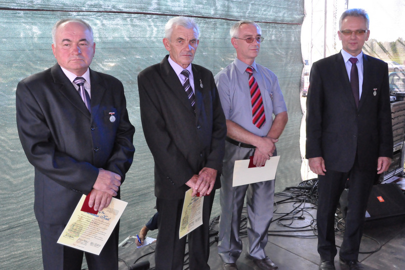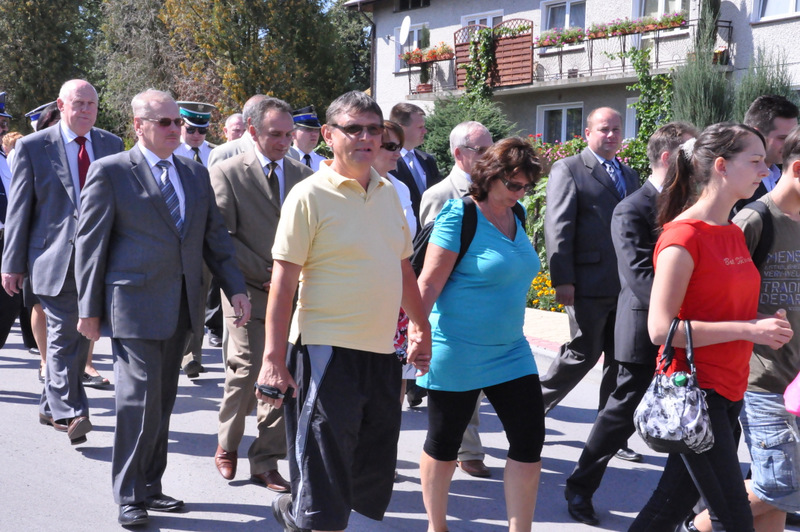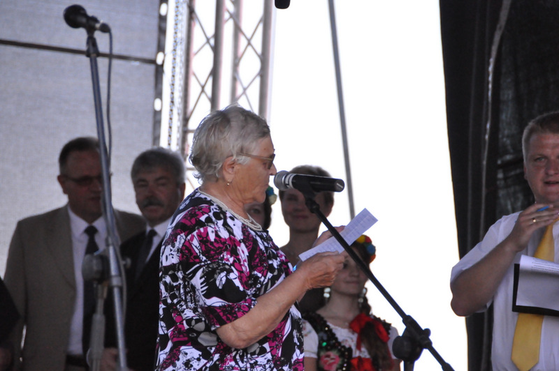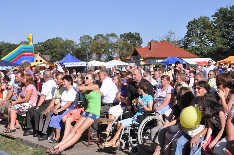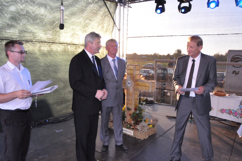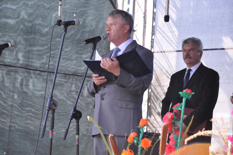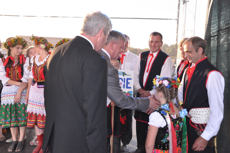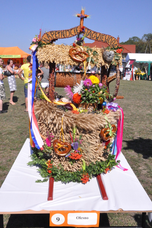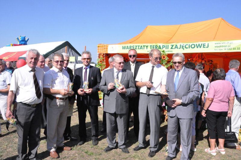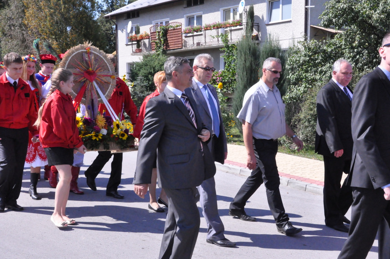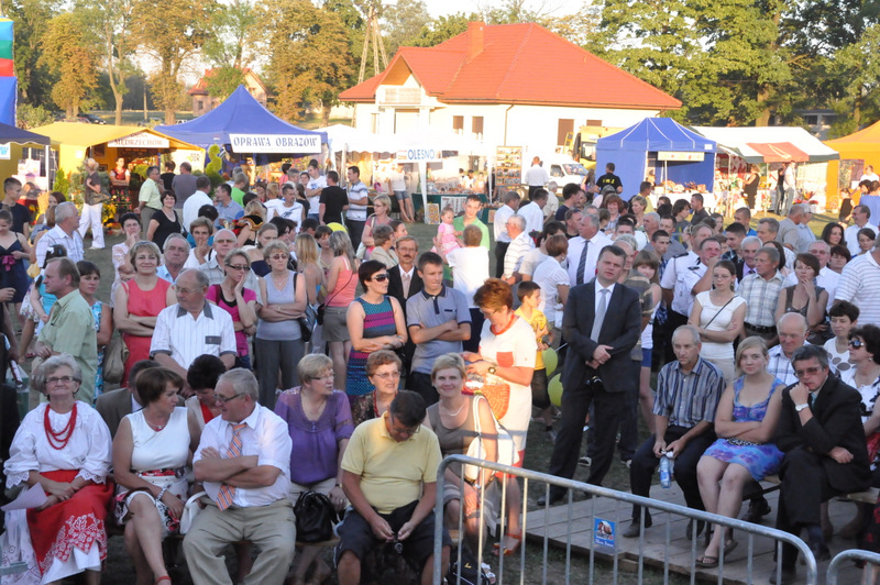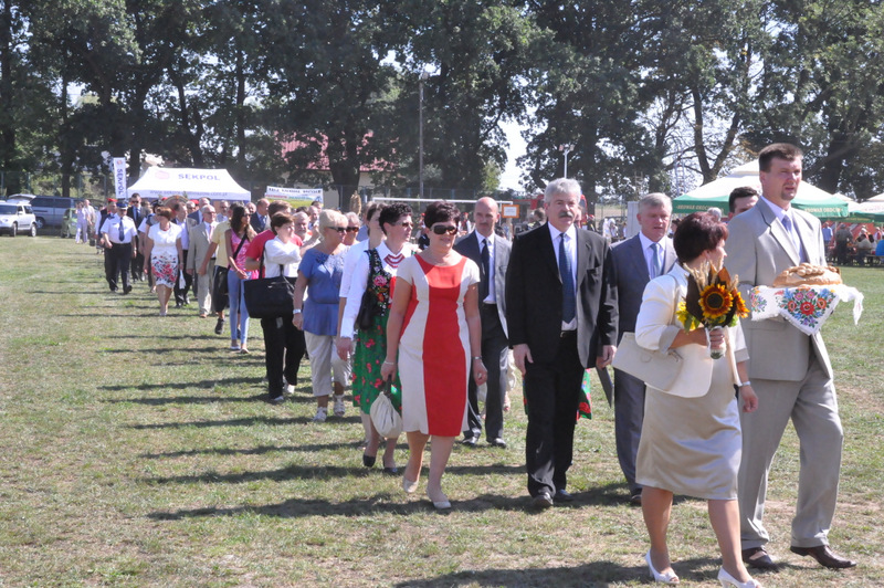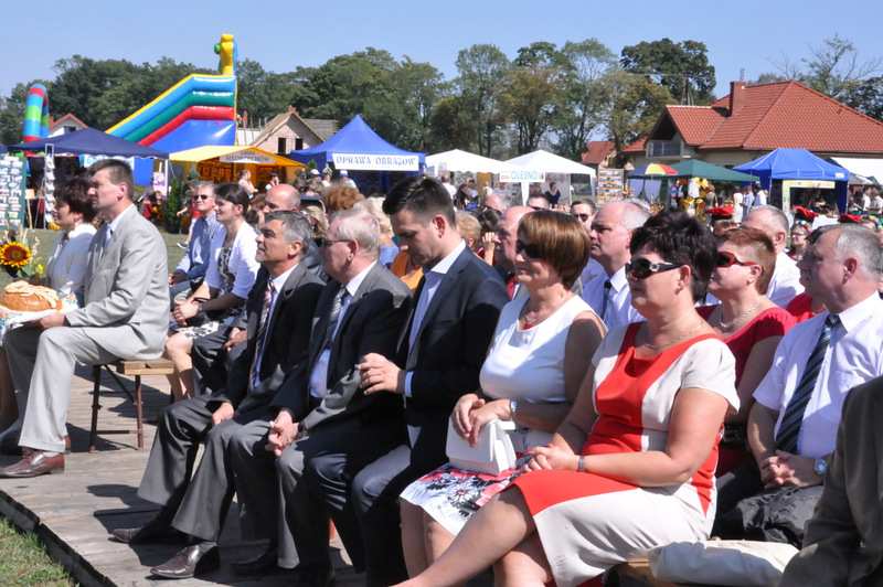 Po nabożeństwie barwny korowód przeszedł na miejscowy obiekt sportowy, gdzie odbywały się prezentacje wieńców dożynkowych i sam obrzęd dożynkowy. Wszystkich uczestników święta powitał Wójt Gminy Olesno – Witold Morawiec, okolicznościowe przemówienie wygłosił Starosta Dąbrowski – Tadeusz Kwiatkowski. Głos zabierali obecni na uroczystościach Posłowie RP Urszula Augustyn, Michał Wojtkiewicz, Robert Wardzała Józef Rojek oraz przedstawiciele Sejmiku Województwa Małopolskiego Wicemarszałek Roman Ciepiela oraz Radny Bolesław Łączyński. Miłym akcentem było wręczenie przez Starostę Dąbrowskiego oraz Radcę Ministra Rolnictwa odznaczeń "zasłużony dla rolnictwa" . Takie odznaczenia z gminy Dąbrowa Tarnowska otrzymali: Jan Czochara, Stanisław Król, Krzysztof Krupa i Jan Sojka. Zgodnie z regulaminem, jako pierwsza zaprezentowała się delegacja Gminy Olesno, która wręczyła dorodny bochen chleba Gospodarzowi Powiatu i Gminy Olesno.