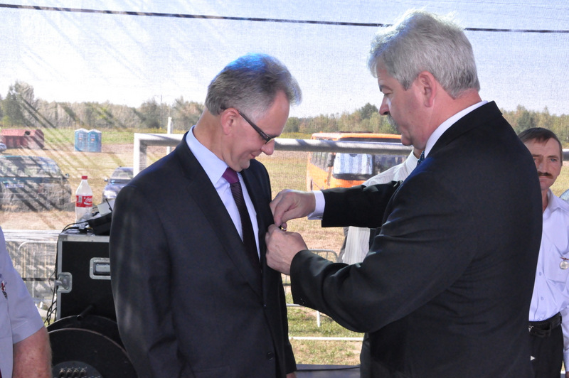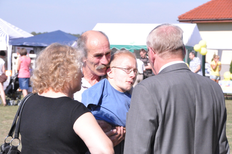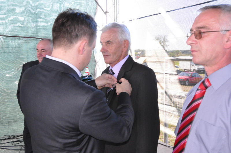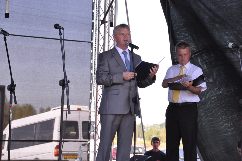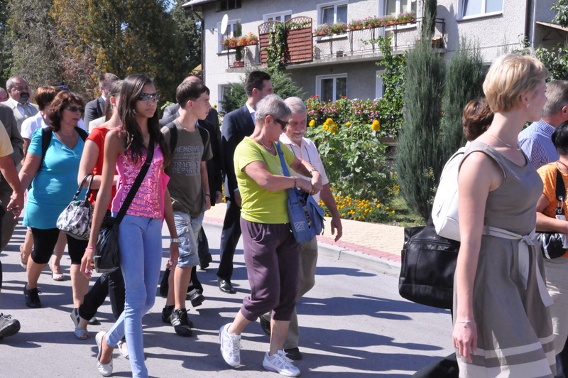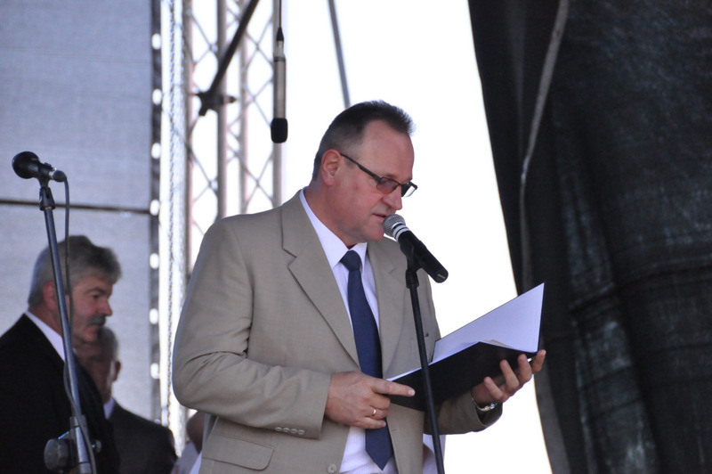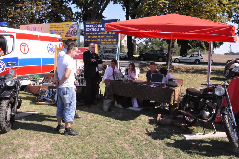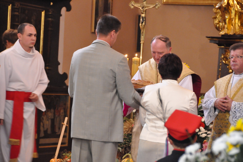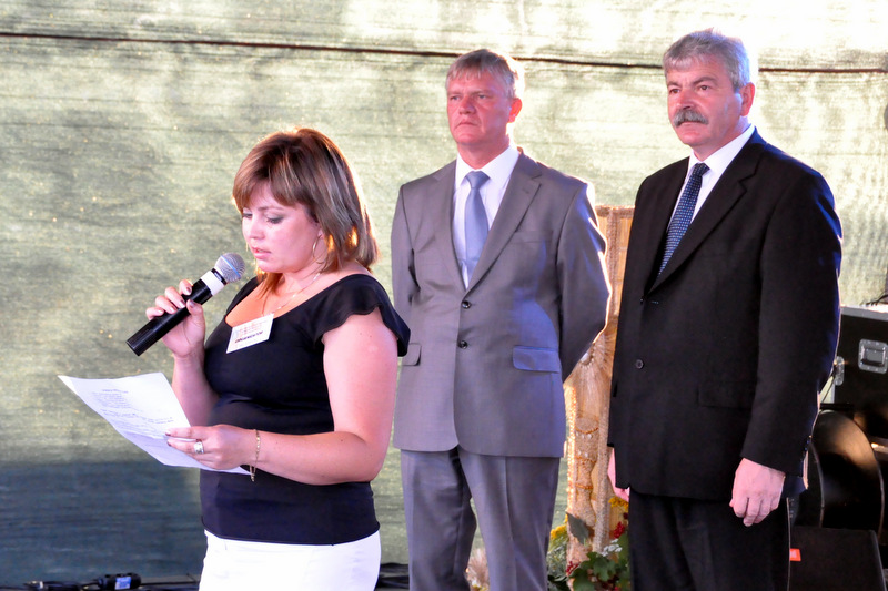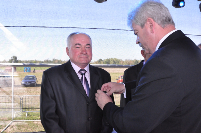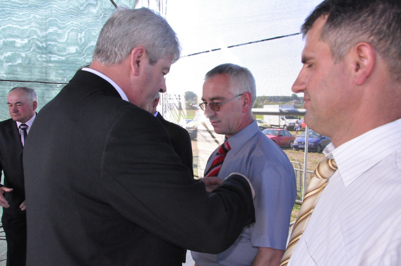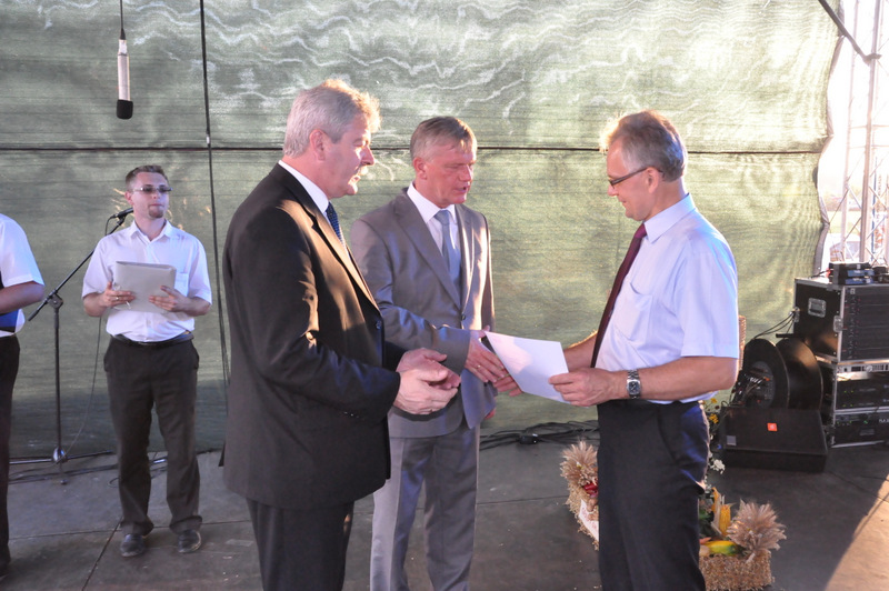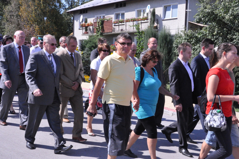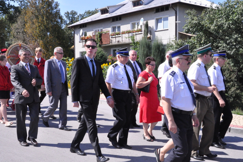 Po nabożeństwie barwny korowód przeszedł na miejscowy obiekt sportowy, gdzie odbywały się prezentacje wieńców dożynkowych i sam obrzęd dożynkowy. Wszystkich uczestników święta powitał Wójt Gminy Olesno – Witold Morawiec, okolicznościowe przemówienie wygłosił Starosta Dąbrowski – Tadeusz Kwiatkowski. Głos zabierali obecni na uroczystościach Posłowie RP Urszula Augustyn, Michał Wojtkiewicz, Robert Wardzała Józef Rojek oraz przedstawiciele Sejmiku Województwa Małopolskiego Wicemarszałek Roman Ciepiela oraz Radny Bolesław Łączyński. Miłym akcentem było wręczenie przez Starostę Dąbrowskiego oraz Radcę Ministra Rolnictwa odznaczeń "zasłużony dla rolnictwa" . Takie odznaczenia z gminy Dąbrowa Tarnowska otrzymali: Jan Czochara, Stanisław Król, Krzysztof Krupa i Jan Sojka. Zgodnie z regulaminem, jako pierwsza zaprezentowała się delegacja Gminy Olesno, która wręczyła dorodny bochen chleba Gospodarzowi Powiatu i Gminy Olesno.