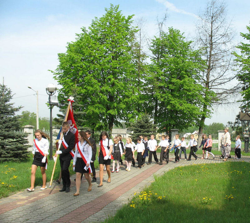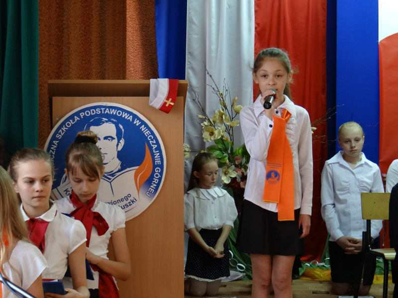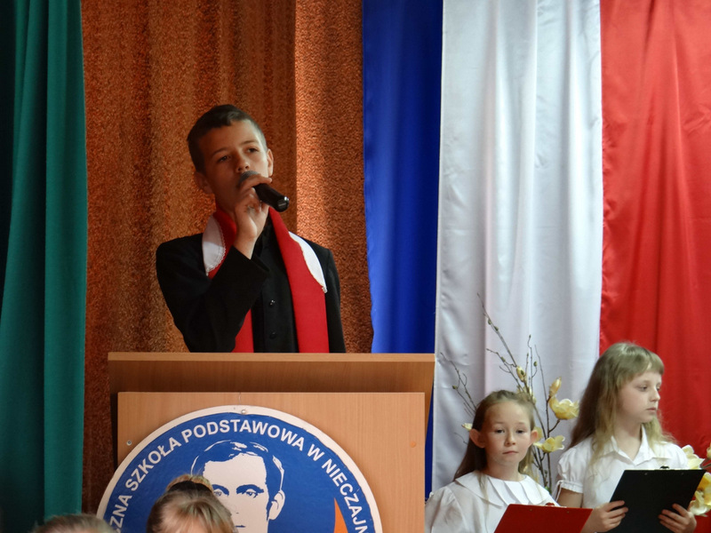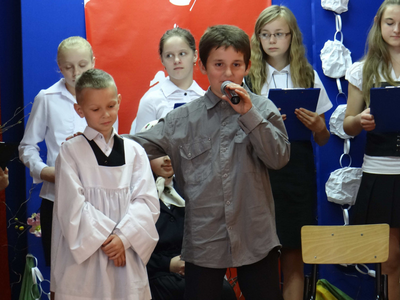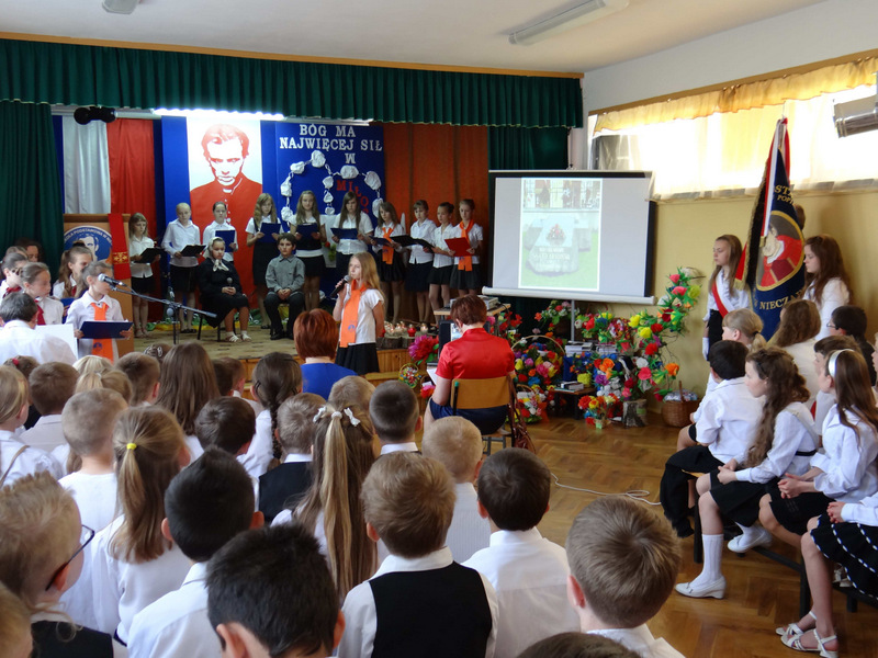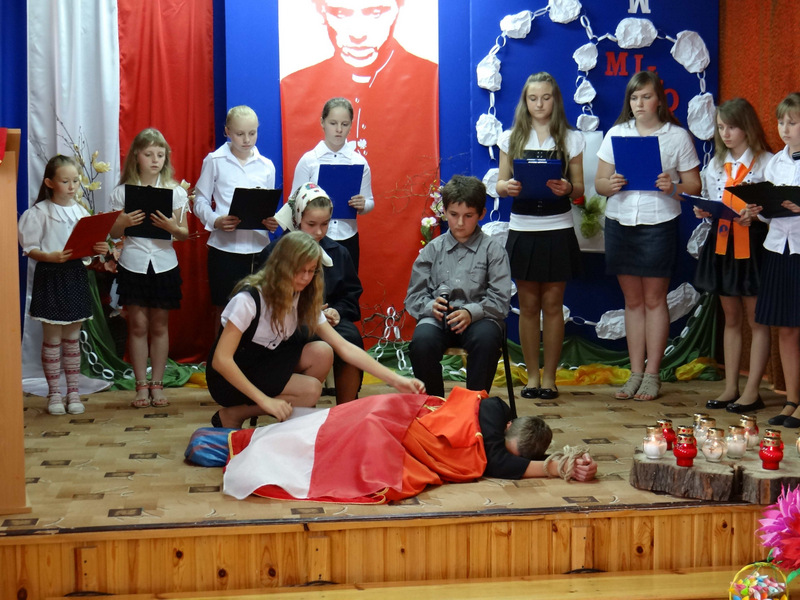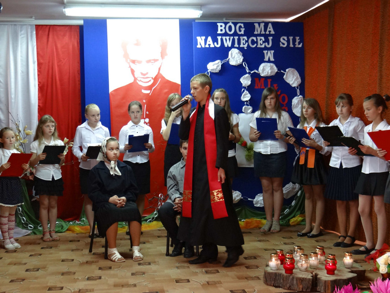 Już w szkole wszystkich uczniów i zaproszonych gości (ks. kanonika Władysława Jaróga i rodziców) powitał p. dyrektor Dariusz Węglowski. Bicie dzwonu Księdza Jerzego (spod kościoła na Żoliborzu w Warszawie) i wejście grupy teatralnej z zapalonymi zniczami było zapowiedzią inscenizowanego montażu słowno-muzycznego pod hasłem cytatu z kazania ks. Popiełuszki „Bóg ma najwięcej sił w miłości”. Ponad godzinę w zupełnej ciszy przerywanej jedynie oklaskami widzowie śledzili życie, działalność duszpasterską i męczeńską śmierć księdza Popiełuszki. Występ wzbogacił pokaz multimedialny, w którym znalazły się slajdy z kwietniowej wycieczki szkolnej do grobu Ks. Jerzego w stolicy. W trakcie montażu odbył się także konkurs recytatorski „Poezja o Księdzu Jerzym”. Występ, oprawę muzyczną i dekorację na tę uroczystość przygotowali nauczyciele: p. Irena Klich, p. Mirela Kiełbasa i p. Waldemar Szlosek.