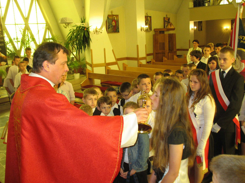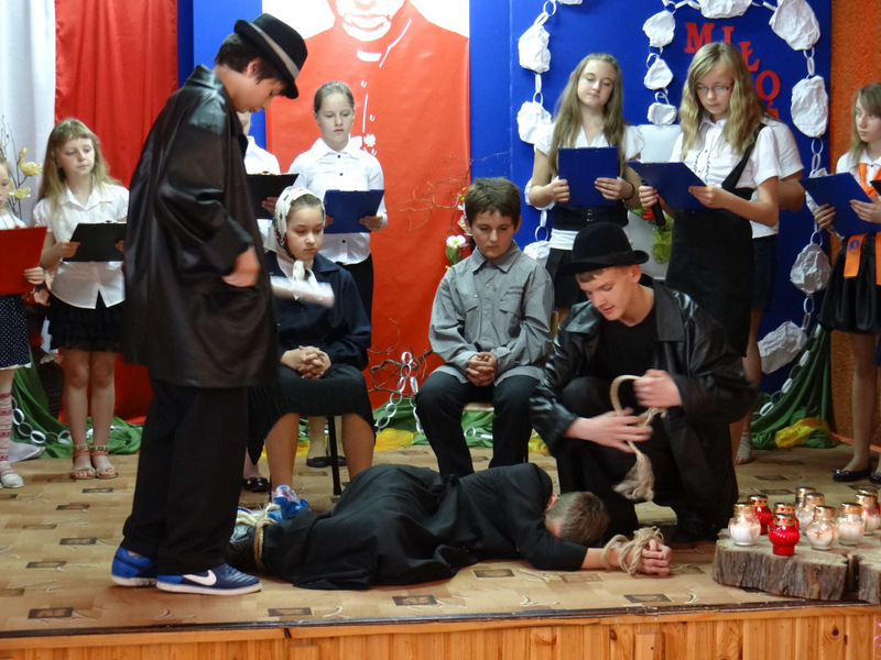 Na zakończenie uczeń odgrywający rolę ks. Popiełuszko wręczył każdemu uczestnikowi pamiątkowy obrazek z modlitwami do Błogosławionego.