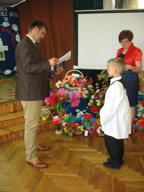 Kolejnym punktem Dnia Patrona było rozstrzygnięcie rodzinnego konkursu plastycznego „Kwiaty na imieniny Księdza Jerzego”, przeprowadzonego w dwóch kategoriach wiekowych (klasy młodsze i starsze) przez nauczycieli: Krystynę Wenc i Dorotę Grzesik. Piękne bibułowe wiązanki kwiatów (41 prac w koszach, wazonach, doniczkach, pniach drzew), wykonane przez poszczególne rodziny, zostały nagrodzone dyplomami i książkami o Patronie zakupionymi w sanktuarium w Warszawie. Niemal cała szkoła, bo wszyscy uczestnicy konkursów i aktorzy zostali poczęstowani słodyczami. Było to możliwe dzięki sponsorom: Radzie Rodziców i indywidualnym ofiarodawcom pragnącym zachować anonimowość.