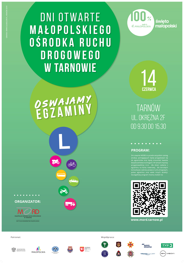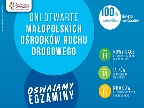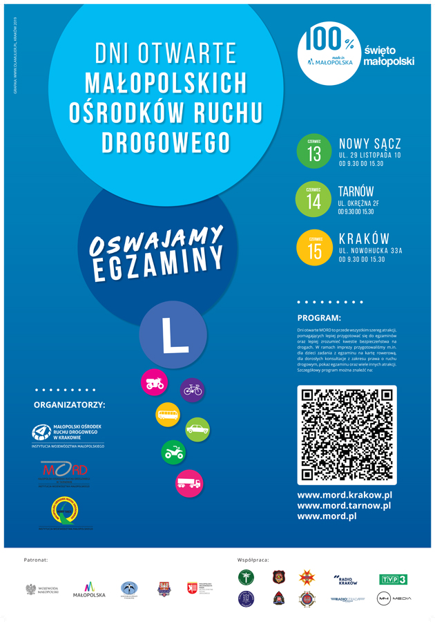 Przewodniczący Małopolskiej WRBRD Wicemarszałek Województwa Małopolskiego Łukasz Smółka i Dyrektor MORD w Krakowie Marek Dworak zapraszają na Dzień Otwarty. Impreza pod hasłem „Oswajamy Egzaminy” ma na celu przybliżenie zagadnień związanych z egzaminowaniem oraz propagować bezpieczeństwo ruchu drogowego. Udział w przedsięwzięciu wezmą – oprócz pracowników MORD w Krakowie - przedstawiciele Instytucji wchodzących w skład Małopolskiej Wojewódzkiej Rady Bezpieczeństwa Ruchu Drogowego: Wydział Ruchu Drogowego Komendy Wojewódzkiej Policji w Krakowie, Wojewódzki Inspektorat Transportu Drogowego w Krakowie, Strażacy i Druhowie ze Straży Pożarnych, Centrum Inicjatyw BRD, Zespół Ratownictwa Medycznego OSP w Białym Kościele, Żandarmeria Wojskowa, Radio Kraków i TVP3 Regionalna.