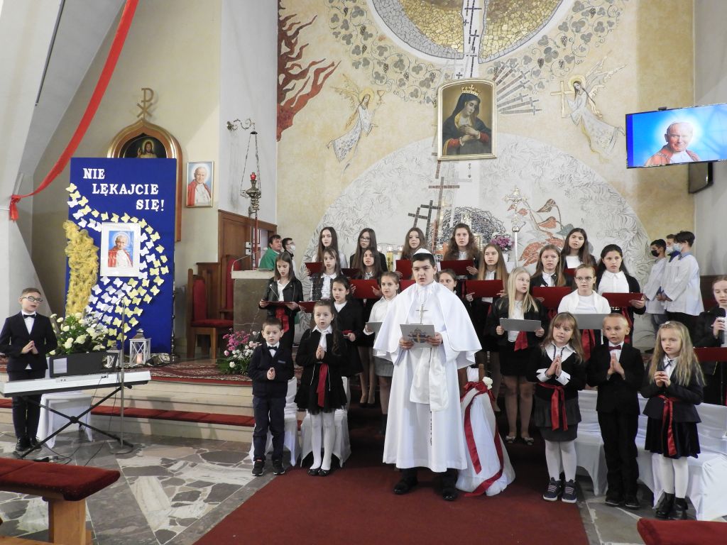 uczniowie klas II – VIII Szkoły Podstawowej im. Błogosławionego ks. Jerzego Popiełuszki wystąpili dwukrotnie w kościele podczas Mszy Świętych. Kolejny występ odbył się we wtorek, 10 października, tym razem dla społeczności szkolnej. Uczniowie otrzymali także karty pracy z kolorowankami, krzyżówkami i wykreślankami o różnym stopniu trudności – aby w pamięć młodego pokolenia, które Papieża zna już tylko z przekazu, zapadło jak najwięcej treści z jego przesłania. Wzruszający montaż i dekoracja to autorskie dzieło nauczycieli: