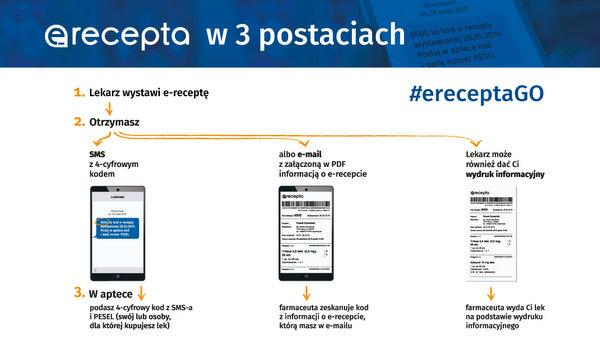 Na wydruku znajdą się m.in.: imię i nazwisko pacjenta, adres, data urodzenia i 4-cyfrowy kod dostępu wygenerowany przez system po wpisaniu danych przez lekarza, a także dane placówki, w której wystawiono druk, i dane lekarza oraz nazwę leku i dawkę. Recepta może też przyjść SMS-em lub mailem. Z taką e-receptą idziemy do apteki, gdzie pokazujemy wydruk lub SMS-a. Farmaceuta skanuje kod i wydaje leki zapisane na e-recepcie.
