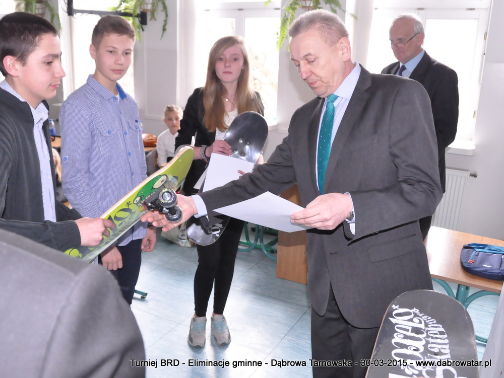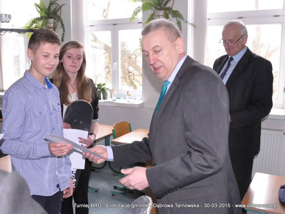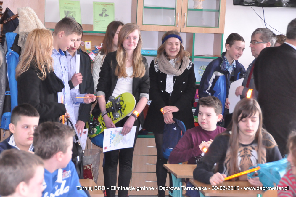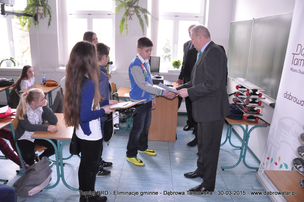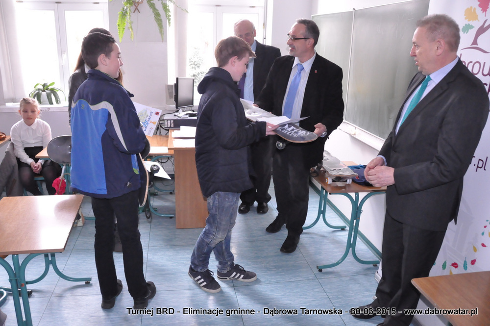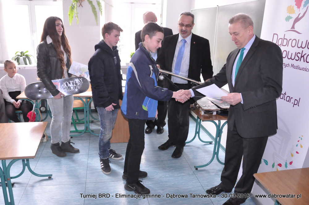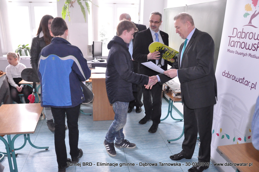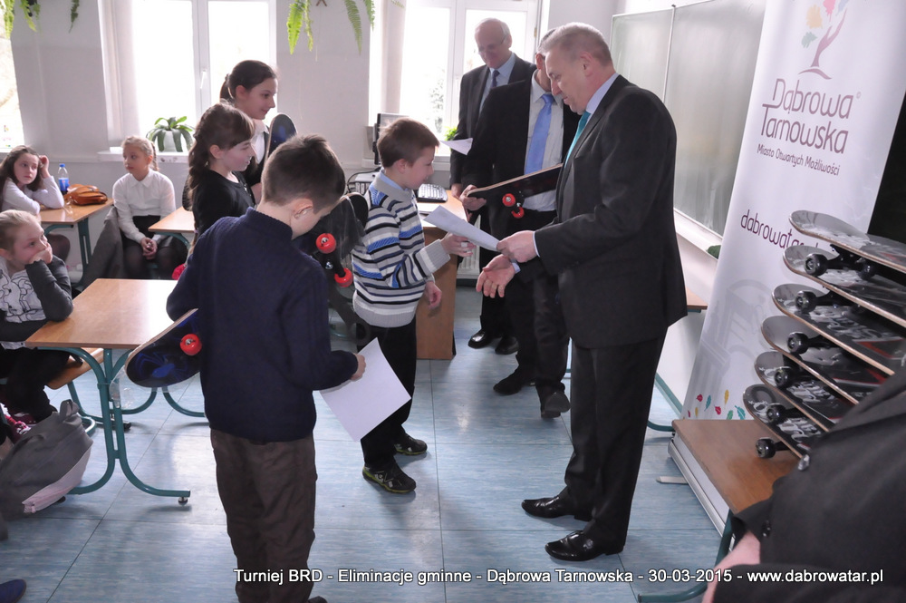 Nagrody dla zwycięzców ufundował Burmistrz Dąbrowy Tarnowskiej Krzysztof Kaczmarski. Nagrody wręczał Z-ca Burmistrza Stanisław Ryczek, który podsumowując rywalizację turniejową podziękował uczestnikom i ich opiekunom za udział oraz życzył zwycięzcom godnego reprezentowania naszej gminy w eliminacjach powiatowych, które odbędą się w Publicznej Szkole Podstawowej Nr 2 w Dąbrowie Tarnowskiej w dniu 14 kwietnia 2014 r. o godz. 9:00. Zwycięskie drużyny ze Szkoły Podstawowej w Smęgorzowie oraz Gimnazjum Nr 1 w Dąbrowie Tarnowskiej będą reprezentować Gminę Dąbrowa Tarnowska na eliminacjach powiatowych.