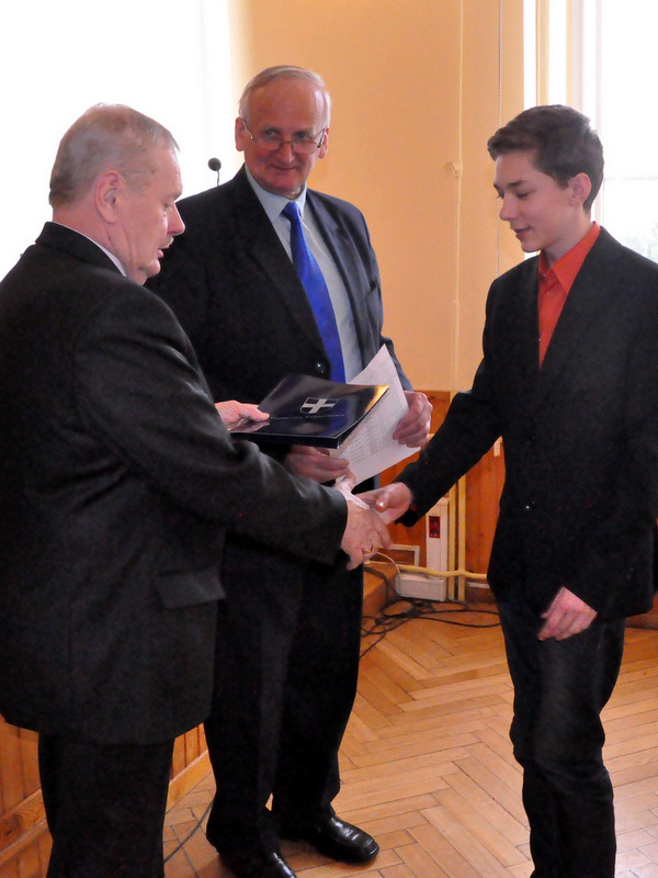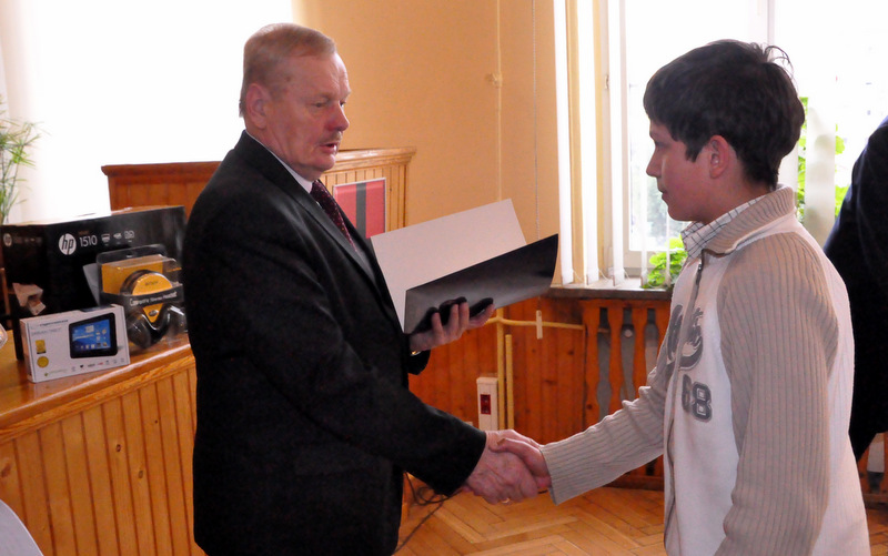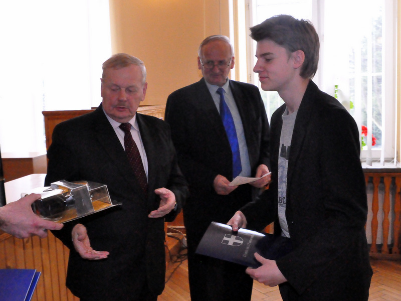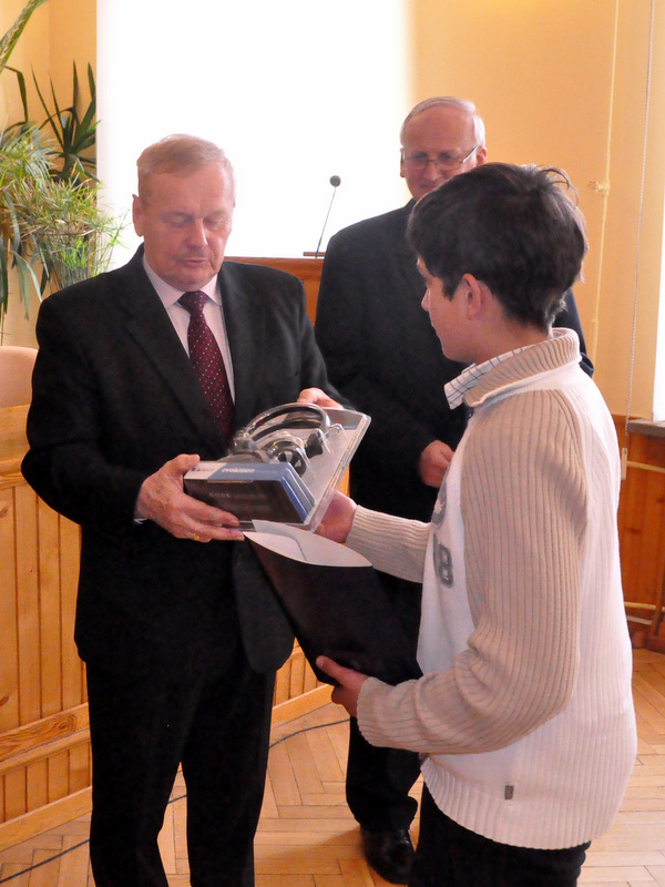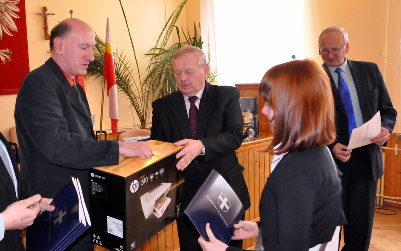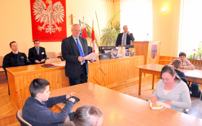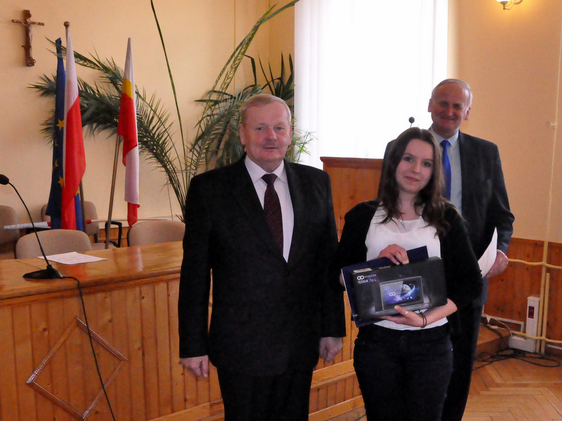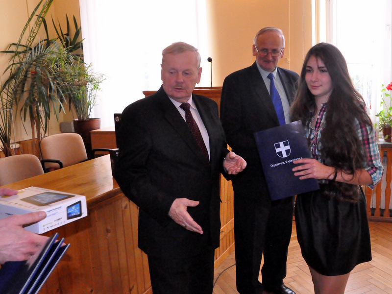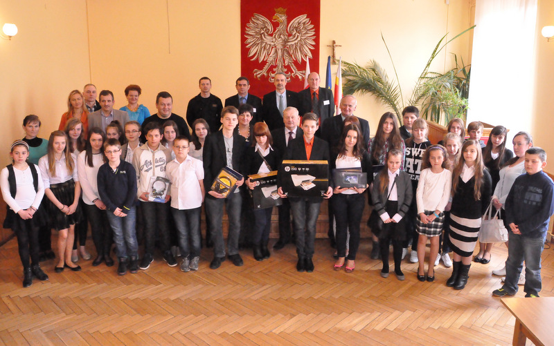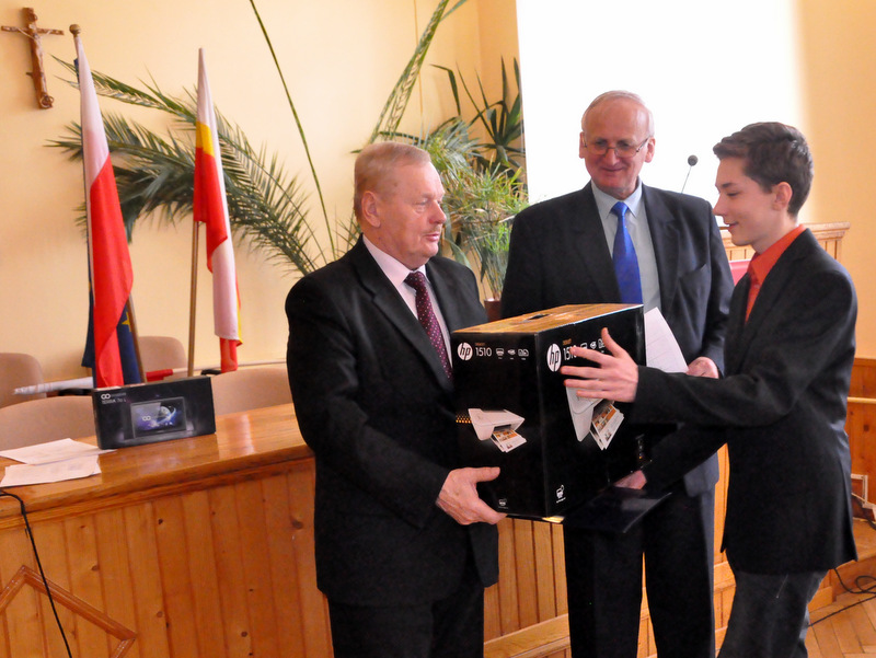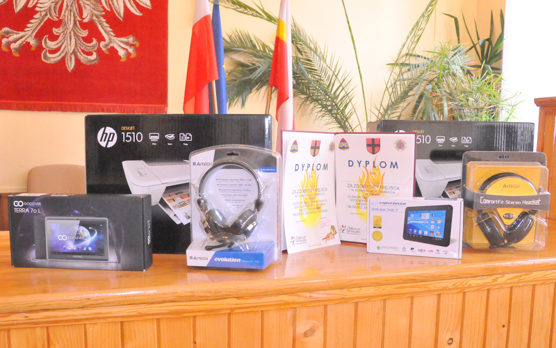 Nagrody dla zwycięzców ufundował i wręczył Burmistrz Dąbrowy Tarnowskiej mgr inż. Stanisław Początek. Nagrody to: 2 tablety, 2 drukarki oraz 2 zestawy słuchawkowe. Burmistrz podsumował konkurs, podziękował uczestnikom i ich opiekunom za udział i życzył zwycięzcom godnego reprezentowania naszej gminy w eliminacjach powiatowych.
