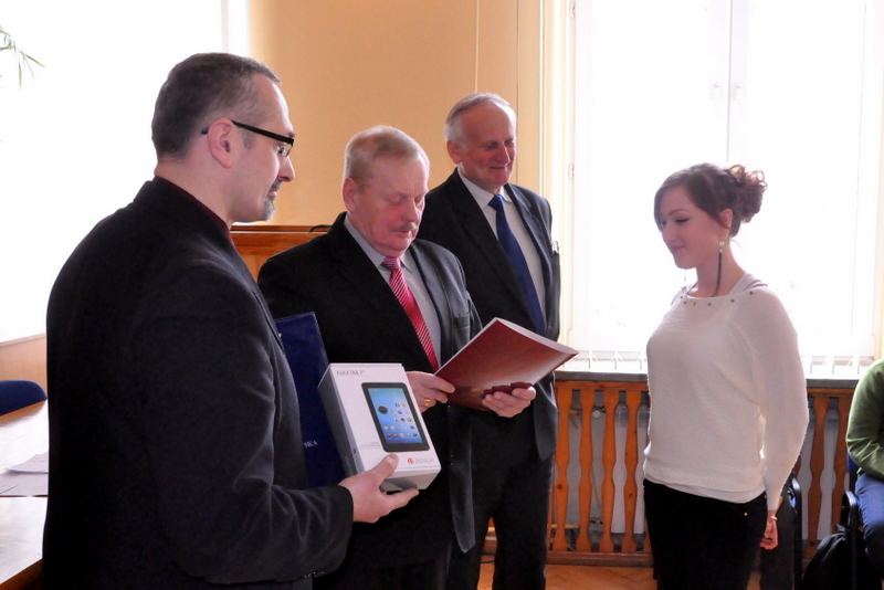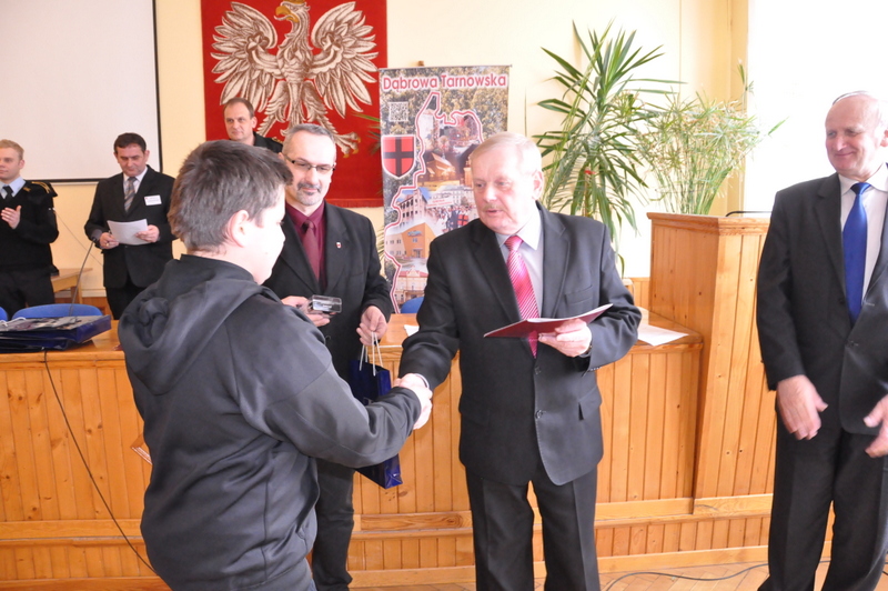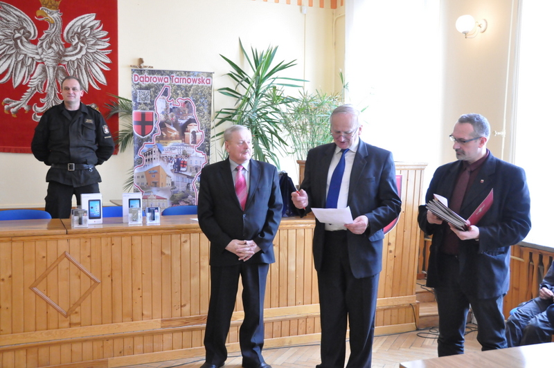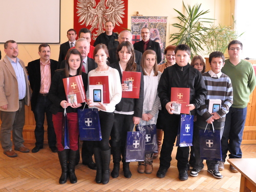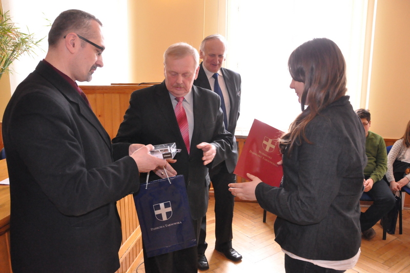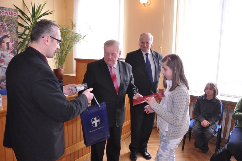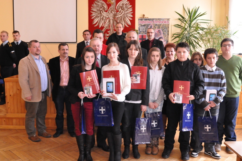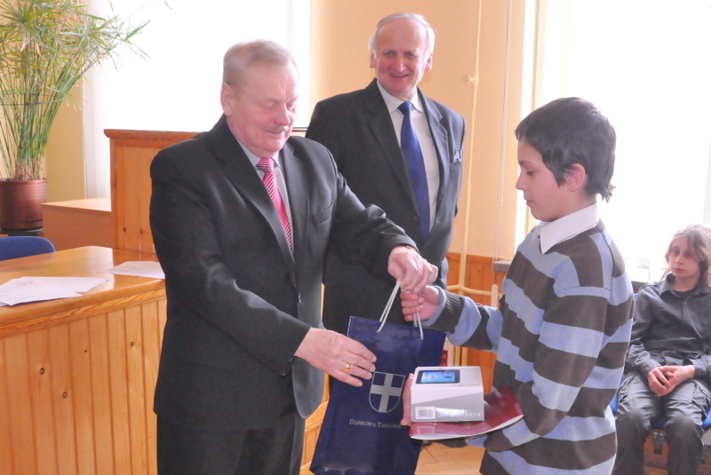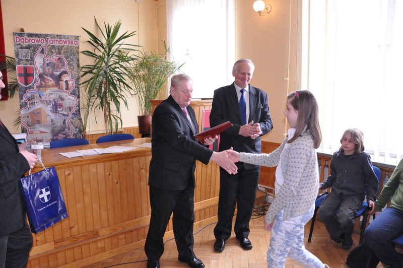 Nagrody dla zwycięzców ufundował i wręczył Burmistrz Dąbrowy Tarnowskiej mgr inż. Stanisław Początek. Nagrody to 2 tablety, 2 odtwarzacze MP3 i 2 odtwarzacze MP4. Burmistrz podsumował konkurs, podziękował uczestnikom i ich opiekunom za udział i życzył zwycięzcom godnego reprezentowania naszej gminy w eliminacjach powiatowych.