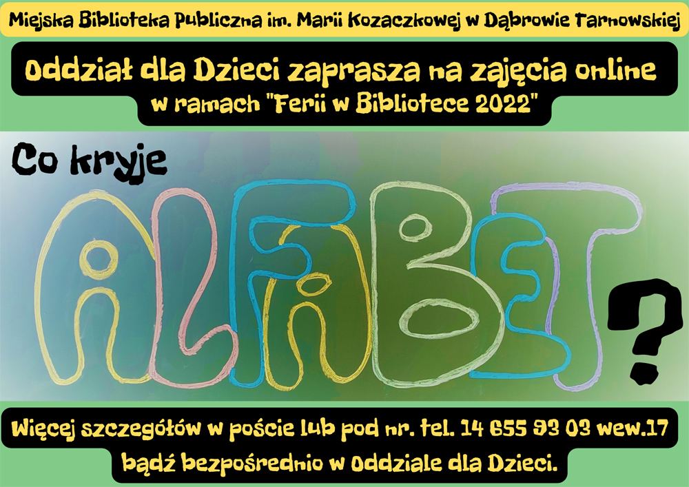 Jak co roku Oddział dla Dzieci Miejskiej Biblioteki Publicznej im. Marii Kozaczkowej w Dąbrowie Tarnowskiej stara się wypełnić zimowy czas wolny swoim najmłodszym czytelnikom. "Ferie w Bibliotece" przebiegać będą w formule online pod hasłem "Co kryje ALFABET?". Spotkania online planowane są od 24 do 28 stycznia (od poniedziałku do piątku) w godz. 11:00-13:00. Obowiązują wcześniejsze zgłoszenia dzieci i wypełnienie "Oświadczenia rodzica" do czwartku 20 stycznia. Wtedy też będzie można odebrać przygotowane dla uczestników "ZESTAWY POMOCnE". Pakiety zostaną wykorzystane podczas zajęć. Bliższe informacje można uzyskać pod nr. tel. 14 655 93 03 wew. 17 lub bezpośrednio w bibliotece. Regulamin zajęć dostępny jest w Oddziale dla Dzieci.