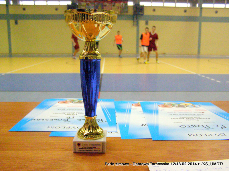W środę 12.02.2014 w Hali Sportowej im Agaty Mróz – Olszewskiej odbył się ostatni turniej piłki nożnej organizowany w ramach Sportowych Ferii w mieście. Do rywalizacji o puchar Burmistrza Dąbrowy Tarnowskiej zgłosiło się dziesięć drużyn: FC Krakus, Dzikusy FC, AVA Grądy, Powiśle Bolesław, FC Wielopole i okolice, Trach, Czerwone Gumisie, FC Porto, Dream Team. Drużyny zostały podzielone na dwie grupy, w których mecze zostały rozegrane każdy z każdym 1 x 7 min. Mecze sędziował Pan Jan Pisarski – któremu serdecznie dziękujemy za bezinteresowną pomoc podczas turnieju.