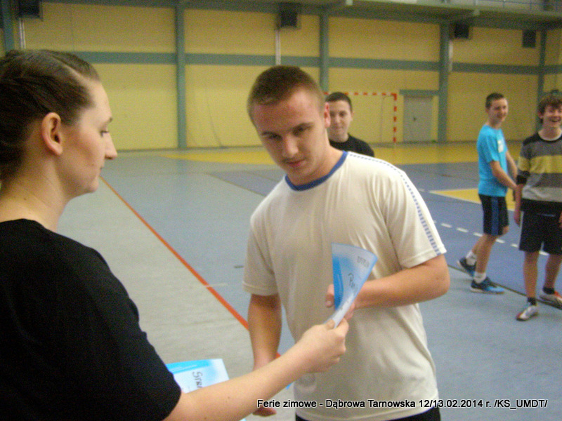 Drużyny zostały nagrodzone pamiątkowymi dyplomami oraz pucharem, które w imieniu Pana Stanisława Początka – Burmistrza Dąbrowy Tarnowskiej wręczała Anna Chmura. TURNIEJ PIŁKI RĘCZNEJ Czwartek 13.02.2014 Hala Sportowa im Agaty Mróz – Olszewskiej zdominowana została przez młodych szczypiornistów. Do turnieju zgłosiło się osiem amatorskich drużyn: Grądy, FC Dzikusy, Wolania, VIVA, Kociaki, HSV, Pumidory, Strażak Karsy, a także pięć drużyn Uczniowskich Klubów Sportowych, które klasyfikowane były odrębnie: Gimnazjum Przecław I, Gimnazjum Przecław II, Gimnazjum Radomyśl, Gimnazjum Wadowice, Gimnazjum Radgoszcz. Wszystkie mecze sędziowali: Szymon Kilian, Krzysztof Kijowski, Tomasz Cichoń. Spotkania rozegrano z podziałem na grupy, w systemie każdy z każdym 1x7 min. Mecze w grupie A: Kociaki – HSV 4:3 Pumidory – Strażak Karsy 0:6 Kociaki – Strażak Karsy 1:7 Pumidory – HSV 3:0 Kociaki – Pumidory 1:3 HSV – Strażak Karsy 2:5 Do dalszej rywalizacji awans zapewniły sobie drużyny Strażak Karsy i Pumidory. Mecze w grupie B: Grądy – FC Dzikusy 1:0 Wolania – VIVA 1:4 Grądy – Wolania 1:3 FC Dzikusy – VIVA 1:1 Grądy – VIVA 2:1 FC Dzikusy – Wolania 5:1 Awans rozgrywek półfinałowych wywalczyły drużyny: Grądy oraz FC Dzikusy PÓŁFINAŁY Strażak Karsy – FC Dzikusy 1:1 (rzuty karne 1:0) Grądy – Pumidory 1:1 (rzuty karne 0:1) Mecz o III miejsce: FC Dzikusy – Grądy 2:3 Mecz o I miejsce: Strażak Karsy – Pumidory 4:3