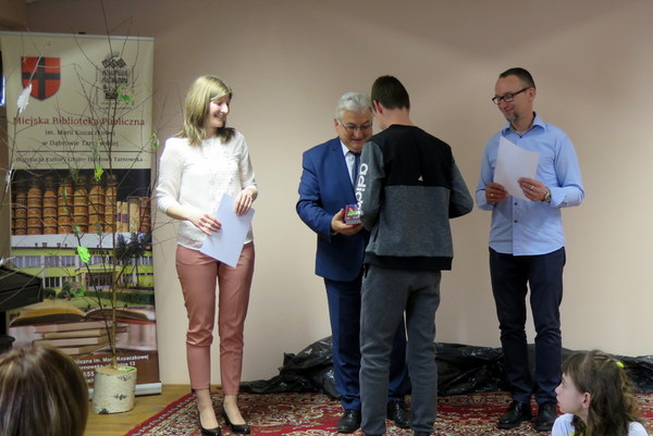 Uroczyste ogłoszenie wyników uświetniła pantomima pod tytułem tegorocznego hasła konkursu w wykonaniu IV klasy Publicznej Szkoły Podstawowej w Nieczajnie Górnej przygotowany pod kierunkiem Pań: Iwony Tańskiej i Anny Wolak. Nagrody książkowe i dyplomy laureatom wręczali: Burmistrz Dąbrowy Tarnowskiej Krzysztof Kaczmarski, przewodniczący komisji Sławomir Bator oraz Edyta Więcek- pracownik MBP, składając wszystkim gratulacje i słowa podziękowania. W finale oprócz uczestników konkursu wzięli udział uczniowie Publicznej Szkoły Podstawowej nr 2 w Dąbrowie Tarnowskiej i kierownik Dziennego Domu "Senior +" Renata Bączek wraz z podopiecznymi. Pokłosiem konkursu jest wystawa pt. „Kocham… lubię… szanuję… dbam o ziemię”, którą można zwiedzać do 30 maja br. w godzinach pracy Działu dla Dorosłych i Młodzieży MBP w DąbrowieTarnowskiej.