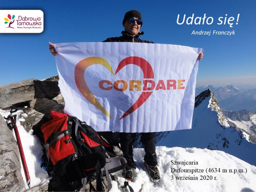 Z ogromną przyjemnością informujemy Wszystkich naszych Przyjaciół, że 3 września miało miejsce historyczne dla naszej Fundacji wydarzenie. W godzinach porannych po prawie sześciogodzinnej trudnej i niebezpiecznej wspinaczce, na Dufourspitze – najwyższym szczycie Szwajcarii i drugim – co do wielkości – szczycie w Europie, liczącym 4634 metrów n.p.m. rozwinięta została flaga CORDARE. Wyczynu tego dokonał jeden z sympatyków Fundacji, Andrzej Franczyk. Pan Andrzej na co dzień pracuje w Sądzie Rejonowym w Dąbrowie Tarnowskiej jako sędzia. Na swoim koncie ma liczne sukcesy zawodowe, zwieńczone przed kilku laty nominacją na wiceprezesa tegoż sądu. Od lat pasjonuje się także wspinaczką wysokogórską. Dokonał już samodzielnego wejścia na najwyższe szczyty w Europie: Mont Blanc (4810), Grossglockner (3798), Weissmies (4023) i wiele innych. Przeszedł wiele dróg w Tatrach i Alpach o trudności IV w skali UIAGM.