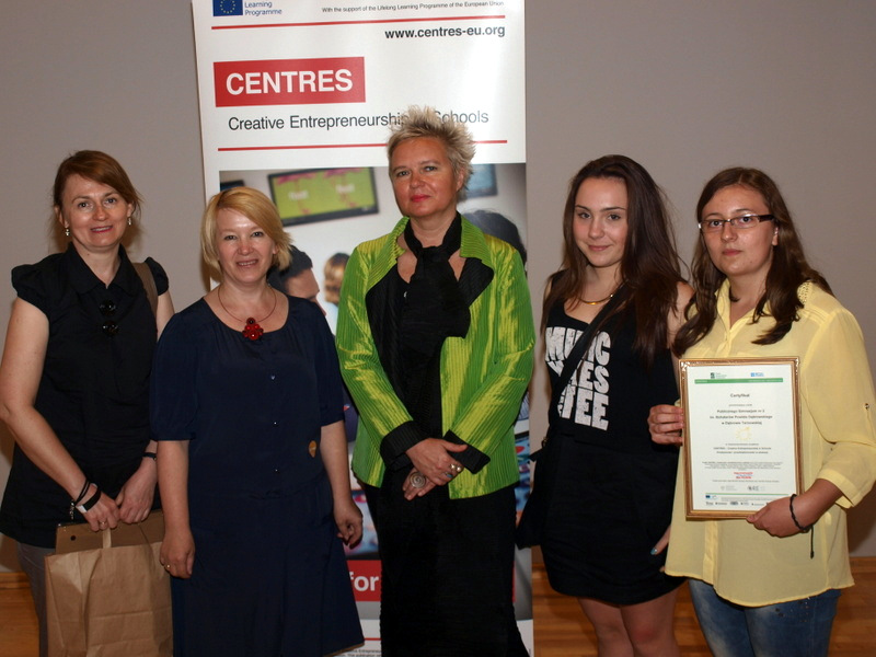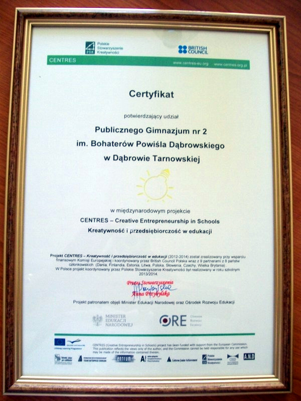 5 czerwca 2014 r. w Centrum Nauki Kopernik w Warszawie odbyło się krajowe podsumowanie międzynarodowego projektu CENTRES "Kreatywność i przedsiębiorczość w edukacji". Do udziału zaproszono przedstawicieli wybranych szkół uczestniczących w projekcie. Na uroczystości obecna była wiceminister edukacji Joanna Berdzik. Certyfikaty udziału w projekcie wręczały: prezes Polskiego Stowarzyszenia Kreatywności Anna Przybylska i koordynator projektu ze strony British Council - Ewa Ayton. Dąbrowskie Publiczne Gimnazjum nr 2 reprezentowały uczennice: Gabriela Jurczyk i Gabriela Zagraniczny oraz polonistka Lucyna Chojnowska.