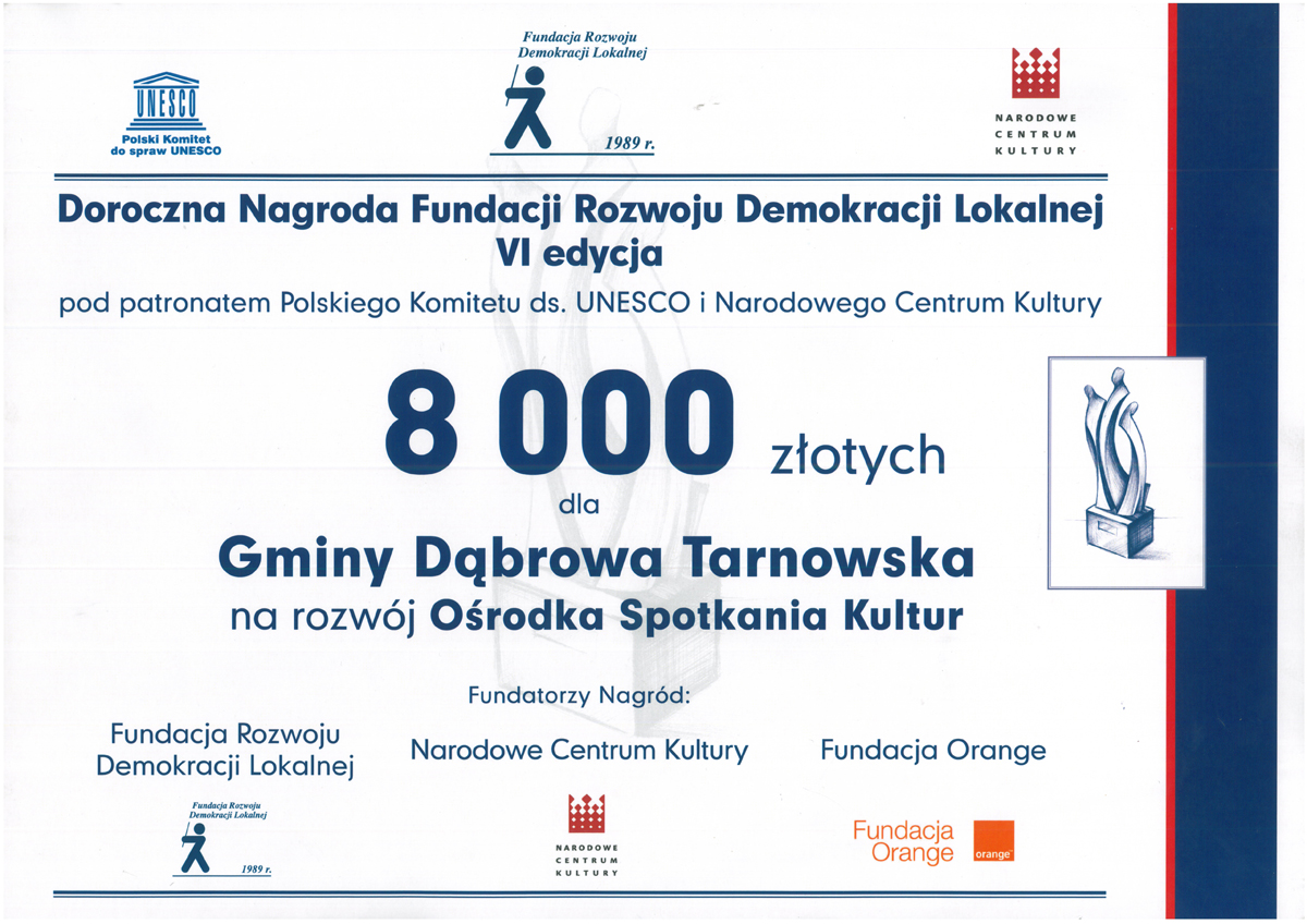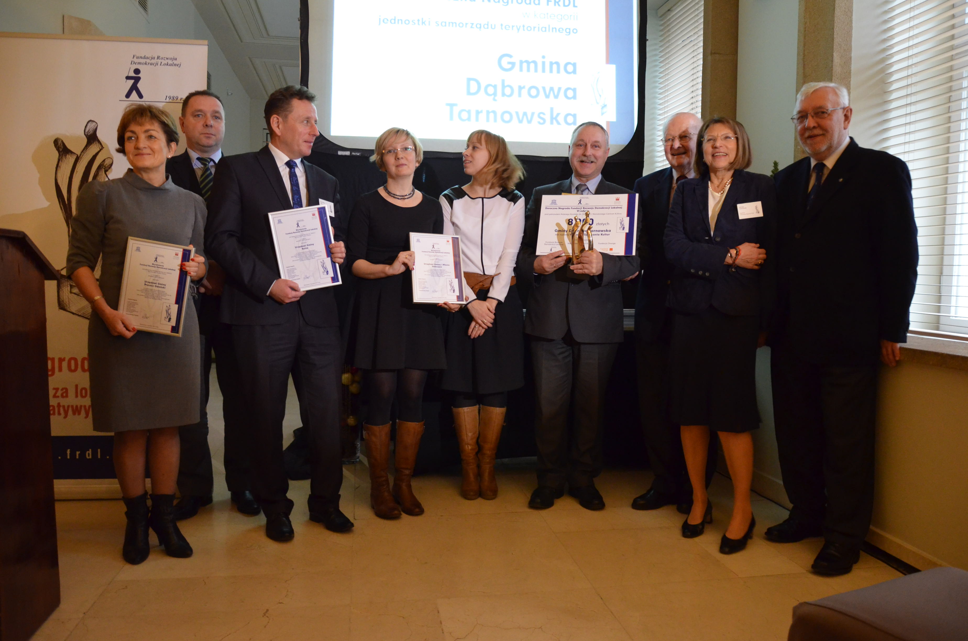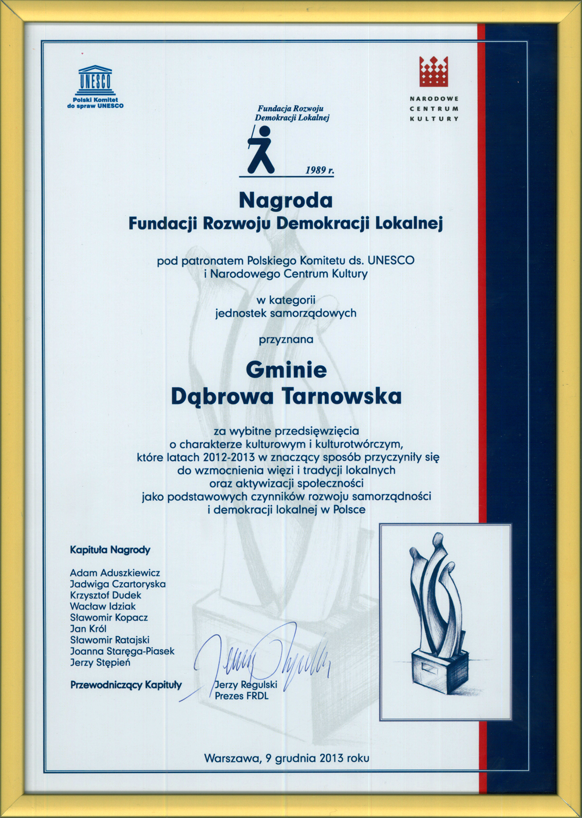 Istniejąca od 1989 r. Fundacja Rozwoju Demokracji Lokalnej – FRDL co roku przyznaje nagrody za inicjatywy kulturalne budujące społeczeństwo obywatelskie. Patronat nad tą inicjatywą sprawują: Polski Komitet ds. UNESCO i Narodowe Centrum Kultury. Nagroda FRDL 2013 statuetka Gmina Dabrowa Tarnowska laureatem VI edycji Dorocznej Nagrody Fundacji Rozwoju Demokracji Lokalnej pod patronatem Polskiego Komitetu ds. UNESCO i Narodowego Centrum KulturyW tym roku Doroczna Nagroda FRDL w kategorii jednostek samorządowych przyznana została Gminie Dąbrowa Tarnowska za realizację zadania renowacji synagogi, perły architektury chasydów, która obecnie służy mieszkańcom i gościom jako Ośrodek Spotkania Kultur. W ramach tego prestiżowego wyróżnienia oprócz statuetki i honorowego dyplomu przyznano naszej gminie 8000 zł na dalszy rozwój Ośrodka Spotkania Kultur. Na ceremonii wręczenia nagród w „Villi Foksal” w Warszawie naszą gminę reprezentował Zastępca Burmistrza Dąbrowy Tarnowskiej – Marek Minorczyk. Oprócz organizatora konkursu fundatorami nagród byli: Narodowe Centrum Kultury oraz  Fundacja Orange. Laureaci nagrodzeni zostali podczas konferencji pt: „WARTO! Lokalna kultura jako wartość”. Wzięli udział w panelu poświęconym tematowi wartości związanych ze społecznymi działaniami w sferze kultury, wymieniając swoje doświadczenia i lokalne perspektywy. W uzasadnieniu nagrody Prezes Fundacji Rozwoju Demokracji Lokalnej Jerzy Regulski napisał, że Dąbrowa Tarnowska otrzymała ją „za wybitne przedsięwzięcia o charakterze kulturalnym i kulturotwórczym, które w znaczący sposób przyczyniły się do wzmocnienia więzi i tradycji lokalnych oraz aktywizacji społeczności jako podstawowych czynników samorządności i demokracji lokalnej w Polsce”. Minister Jacek Michałowski, Szef Kancelarii Prezydenta Rzeczypospolitej Polskiej, wystosował list do uczestników konferencji. Nawiązując do przyszłorocznego jubileuszu 25-lecia istnienia Fundacji Rozwoju Demokracji Lokalnej pogratulował jej twórcom wytrwałych działań na rzecz budowania społeczeństwa obywatelskiego. Laureatom Dorocznej Nagrody pogratulował sukcesu, życząc, aby wyróżnione projekty stanowiły źródło satysfakcji dla ich twórców i przynosiły wiele pożytku lokalnym społecznościom. W czasie gali prelekcje wygłosili goście specjalni. Ks. Adam Boniecki, Redaktor Senior „Tygodnika Powszechnego” skupił się w swoim wystąpieniu na próbie zdefiniowania samego terminu „wartość”. Dr Tomasz Rakowski z Instytutu Etnologii i Antropologii Kulturowej Uniwersytetu Warszawskiego opowiedział, jak aktywizować społeczności wiejskie i peryferyjne za pomocą sztuki, bez narzucania im swoich koncepcji. Moment ogłoszenia wyników i wręczenia nagród był dla zebranych przedstawicieli 20 najwyżej ocenionych przez Kapitułę projektów momentem szczególnie oczekiwanym. W każdej z czterech kategorii przyznane zostały: jedna nagroda główna i cztery wyróżnienia.