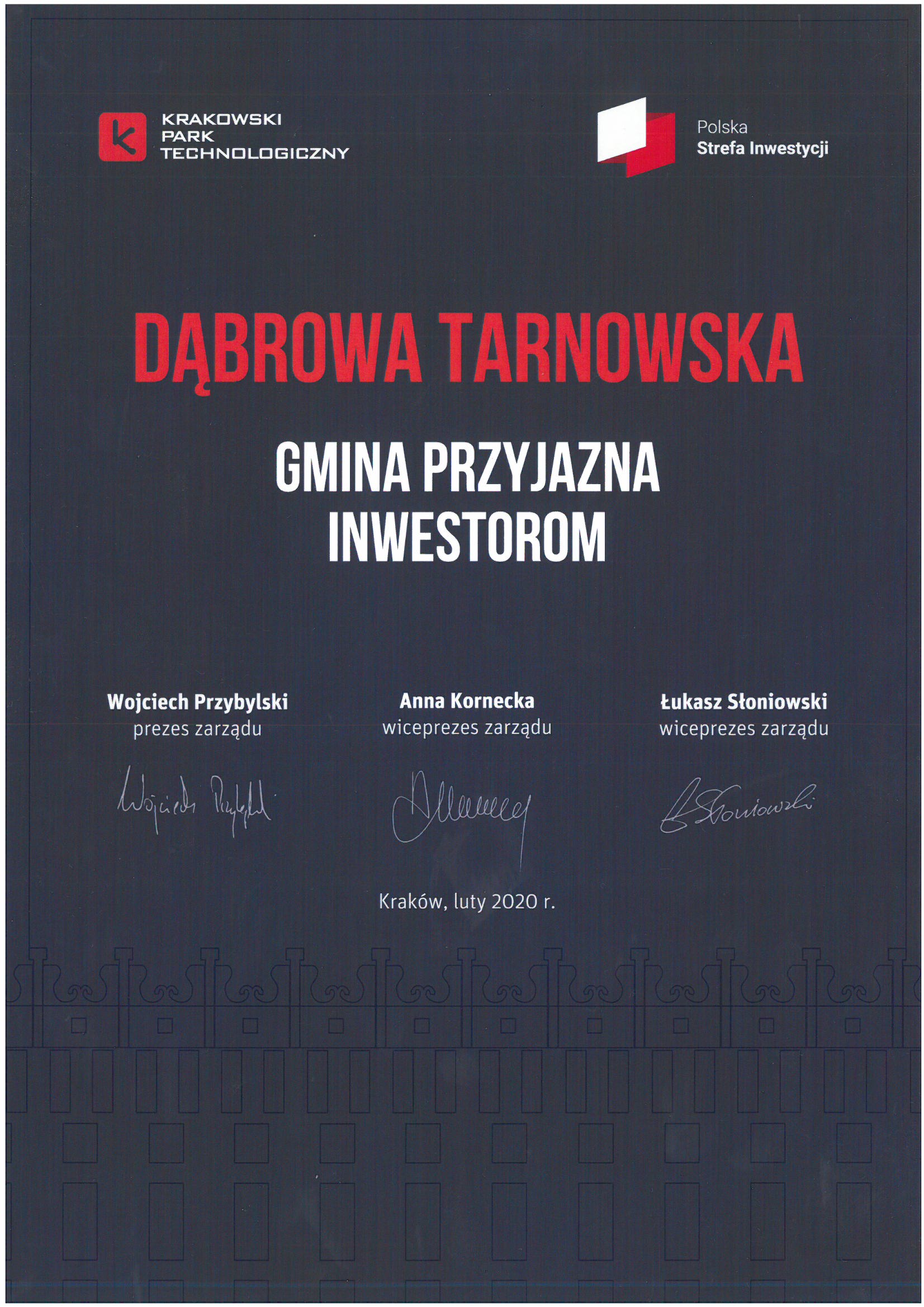 W czwartek 20 lutego br. wręczone zostały nagrody Krakowskiego Parku Technologicznego. Uroczystość ta odbyła się w obecności wicepremiera, a zarazem ministra nauki i szkolnictwa wyższego Jarosława Gowina, minister rozwoju Jadwigi Emilewicz, ministra rozwoju oraz prezesa Krakowskiego Parku Technologicznego Wojciecha Przybylskiego. Gminę Dąbrowa Tarnowska reprezentował burmistrz Krzysztof Kaczmarski, który odebrał statuetkę dla „gminy przyjaznej inwestorom”.