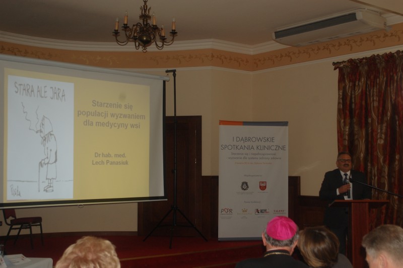Po uroczystym otwarciu konferencji głos zabrał Starosta Dąbrowski Tadeusz Kwiatkowski, który przedstawił Powiśle Dąbrowskie, miejsca warte zobaczenia oraz metamorfozę dąbrowskiego szpitala – remonty oraz pozyskane sprzęty. Następnie odczytano fragmenty listów z pozdrowieniami od osób, które z różnych przyczyn nie mogły uczestniczyć w spotkaniu. W programie konferencji zaplanowano 10 referatów, które zostały wygłoszone przez różnych prelegentów. Wykład pt. „Systemowe konsekwencje procesu starzenia się ludności" w imieniu Ministra Pracy i Polityki Społecznej wygłosiła Wiceminister Małgorzata Marcińska. Następnie prof. UJK dr hab. med. Ireneusz Kotela wraz z dr n. med. Andrzejem Kotelą wygłosili referat pt. „Urazy wieku podeszłego przyczyną niepełnosprawności – narastający problem społeczny i ekonomiczny". Referat nt. „Współczesnych możliwości leczenia przewlekłych ran" wygłosił prof. dr hab. med. Antoni Czupryna. Dr Michał Seweryn Malopolski Państowy Wojewódzki Inspektor Sanitarny przedstawił „Rolę działań prewencyjnych w opiece nad osobami starszymi z punktu widzenia inspekcji sanitarnej". Prof. dr hab. med. Lucyna Mastalerz przedstawiła referat, w którym poruszyła dwa wątki, a mianowicie przyznanie prestiżowej nagrody Friedrichowi Wegenerowi oraz przyczyny powstawania kaszlu. Po jej wystąpieniu odbyła się krótka przerwa, podczas której dla zgromadzonych gości zagrał Bartosz Dworak QUARTET – zespół jazzowy. O „Przywracaniu sprawności narządu ruchu u pacjentów ze schorzeniami reumatycznymi i zapalnymi" mówili: lek. med. Jolanta Bucka i dr n.med. Andrzej Kosiniak – Kamysz. Drugą cześć spotkania rozpoczął Ks. Abp. Zygmunt Zimowski, który przekazał pozdrowienia od Papieża Franciszka słowami „Pozdrawiać wszystkich. Z serca im błogosławię". Ksiądz Arcybiskup wygłosił krótki referat nt. „Roli kościoła w wyzwaniu, jakim jest starzenie się". Przywołał także postać obecnego na sali ks. Prałata Józefa Poremby, który zrobił tak wiele w omawianej na konferencji dziedzinie w naszym powiecie. Wykład Ks. Arcybiskup zakończył modlitwą o starości „Boże mój tak dawno już po świecie chodzę...". Kolejny wykład wygłosił prof. IMW dr hab. med. Lech Panasiuk (Instytut Medycyny Wsi w Lublinie), w którym mówił o „Starzeniu się populacji a wyzwaniach dla medycyny wsi". Andrzej Kopta ze Społecznego Komitetu Ratowników Medycznych opowiedział o „Starzeniu się populacji a zadaniach systemu Państwowego Ratownictwa Medycznego". Ostatni wykład „Bezpieczeństwo pacjenta w wieku podeszłym" przedstawili: dr n. o zdr. Maria Mika (PWSZ w Tarnowie) oraz dr n. o zdr. Marcin Mikos (Polskie Towarzystwo Prawa Medycznego). Konferencję zakończył Ks. Arcybiskup Zygmunt Zimowski błogosławieństwem oraz zapewnieniem, że w przyszłym roku odbędzie się kolejne tego typu spotkanie.
