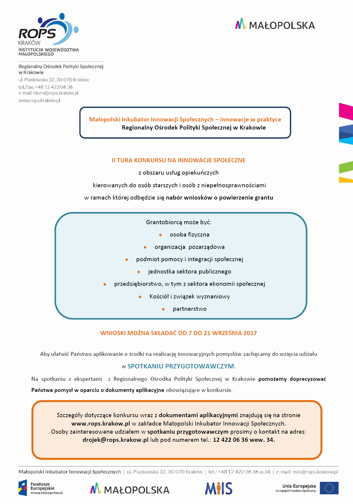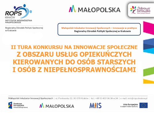 Małopolski Inkubator Innowacji Społecznych - innowacje w praktyce Regionalny Ośrodek Polityki Społecznej w Krakowie zaprasza do udziału w II turze Konkursu na Innowacje Społeczne z obszaru usług opiekuńczych kierowanych do osób starszych і osób z niepełnosprawnościami w ramach której odbędzie się nabór wniosków o powierzenie grantu. Grantobiorcą może być: osoba fizyczna, organizacja pozarządowa, podmiot pomocy і integracji społecznej, jednostka sektora publicznego, przedsiębiorstwo, w tym z sektora ekonomii społecznej, kościół і związek wyznaniowy. Wnioski można składać od 7 do 21 września 2017.