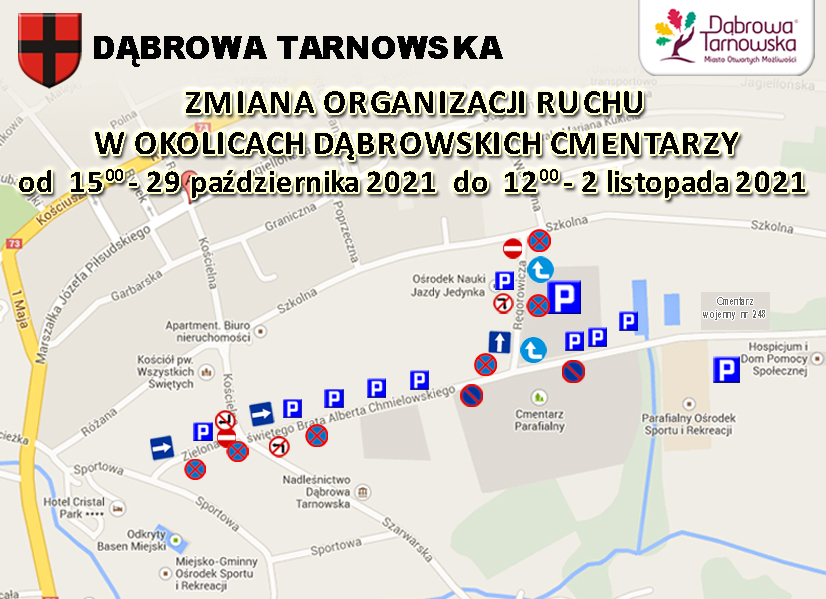 Informujemy, w okresie Świąt Wszystkich Świętych, tj. w dniach 29 października 2021 r. od godz. 1500 do 2 listopada 2021 r. do godz. 1200 wprowadzona zostaje zmiana organizacji ruchu w obrębie cmentarza parafialnego w Dąbrowie Tarnowskiej. Podobnie jak w roku ubiegłym udostępnione zostały parkingi na terenie Ośrodka Nauki Jazdy „Jedynka” Pawła Drożdża przy ul. Ręgorowicza i ul. Św. B. A. Chmielowskiego oraz Firmy “Hydroland” Dariusza Lizaka przy ul. Św. B. A. Chmielowskiego. Zachęcamy do zapoznania się z tymi zmianami i nowych zasad organizacji ruch w obrębie dąbrowskich nekropolii oraz stosowanie się do poleceń Policji.